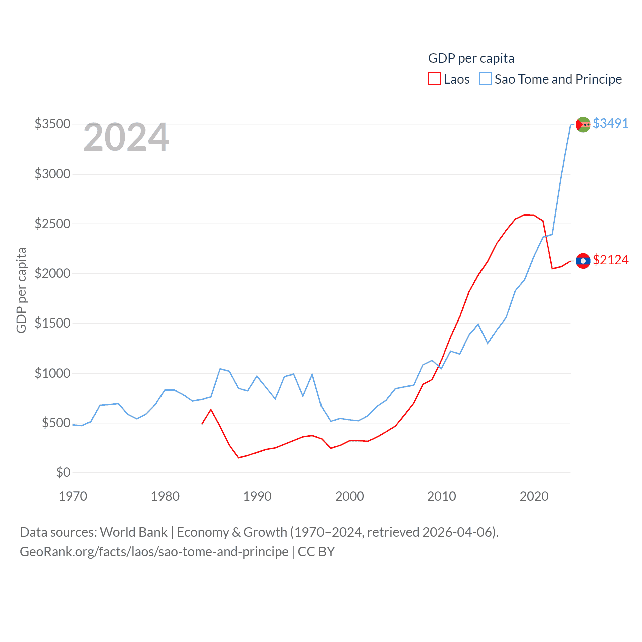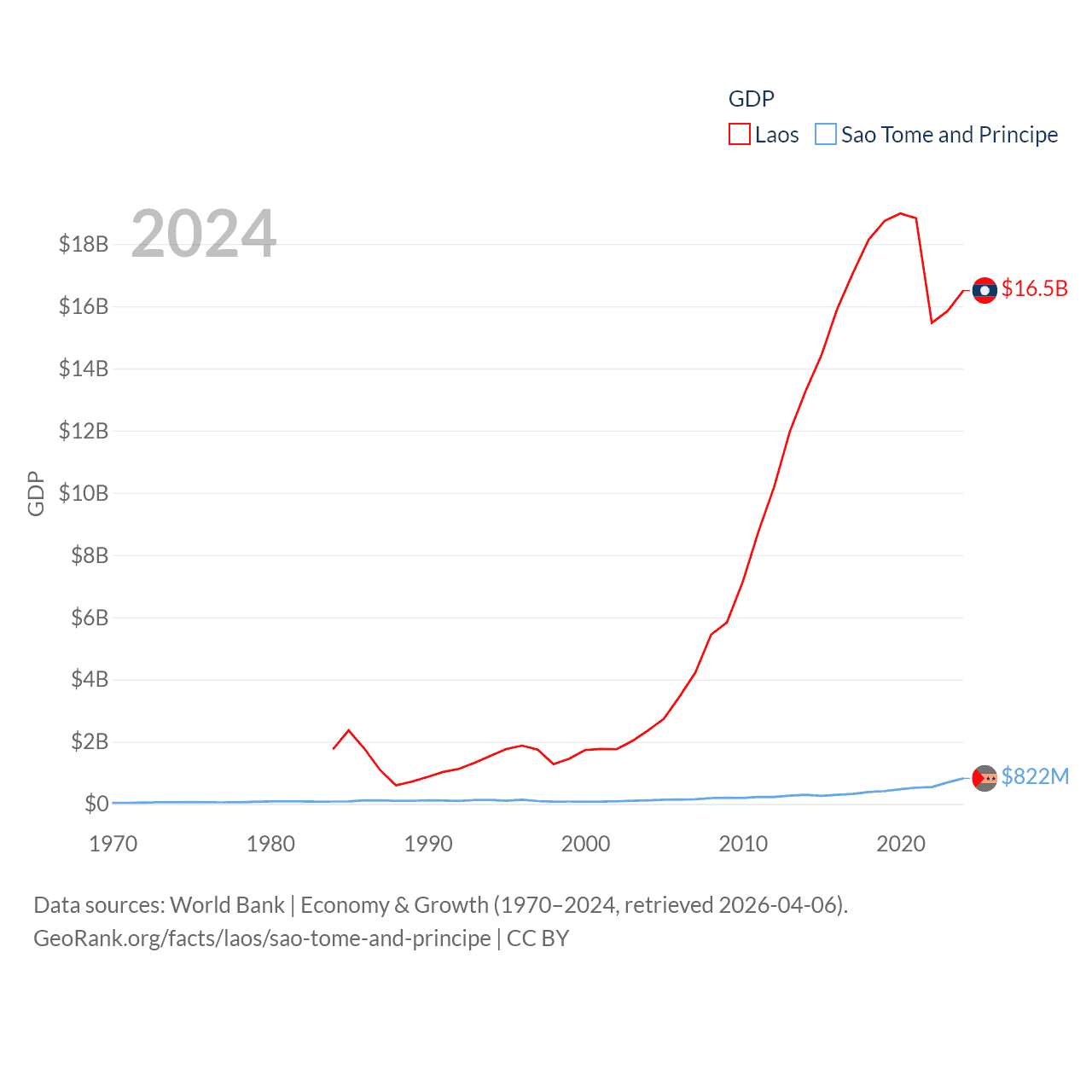 By GDP, Laos ranks 139/197 ($16.5B) and Sao Tome and Principe ranks 189/197 ($822M). By GDP per capita, Laos ranks 155/197 ($2,124), while Sao Tome and Principe ranks 134/197 ($3,491).