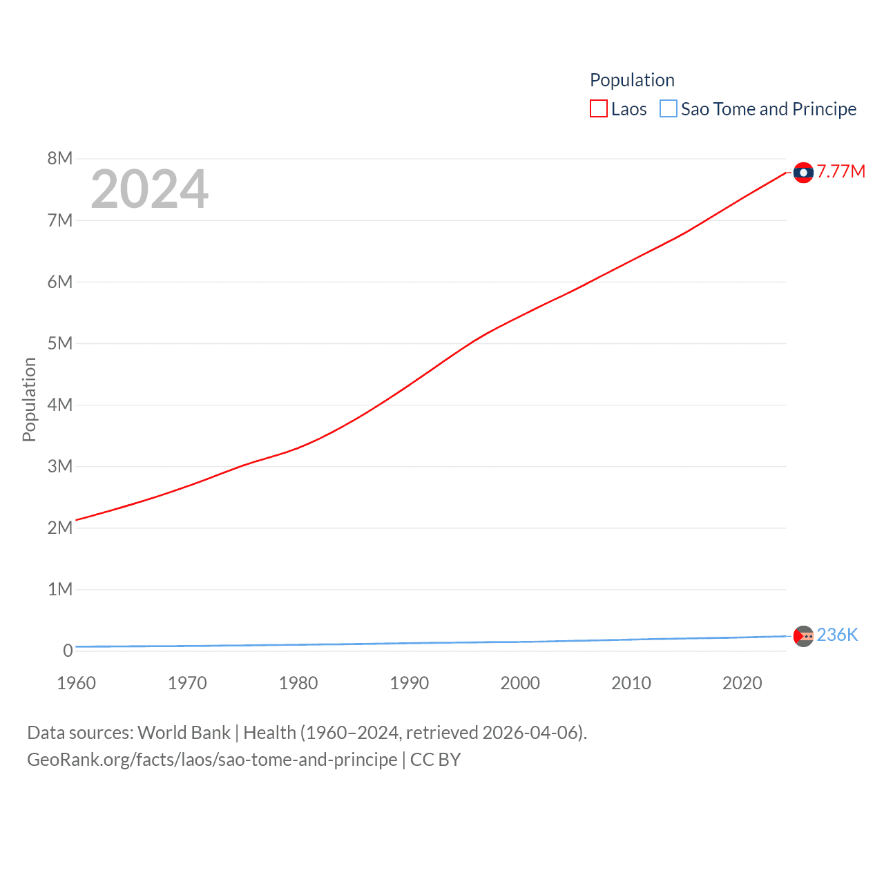 Laos has a population of 7.77M (ranked 103/197), compared with 236K in Sao Tome and Principe (ranked 176/197). Laos' land area is 89,112 sq mi versus 371 sq mi for Sao Tome and Principe (ranked 79th vs. 172nd).
