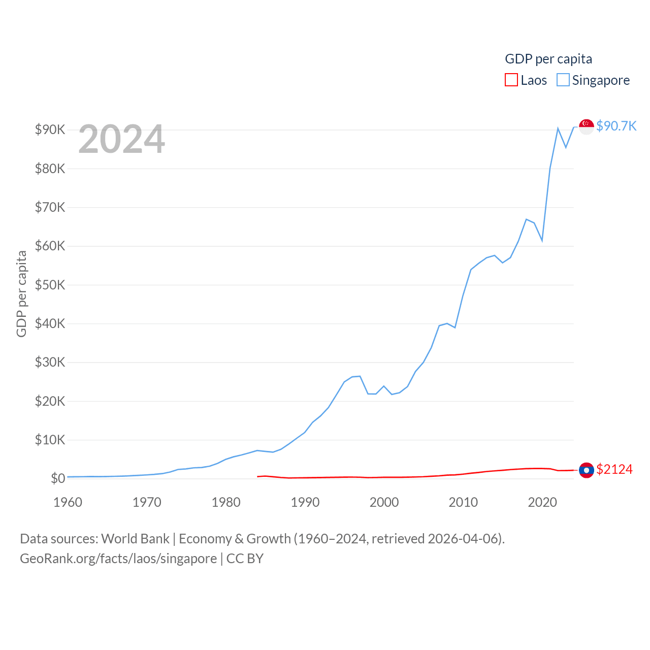 By GDP, Laos ranks 139/197 ($16.5B) and Singapore ranks 28/197 ($547B). By GDP per capita, Laos ranks 155/197 ($2,124), while Singapore ranks 7/197 ($90,674).
