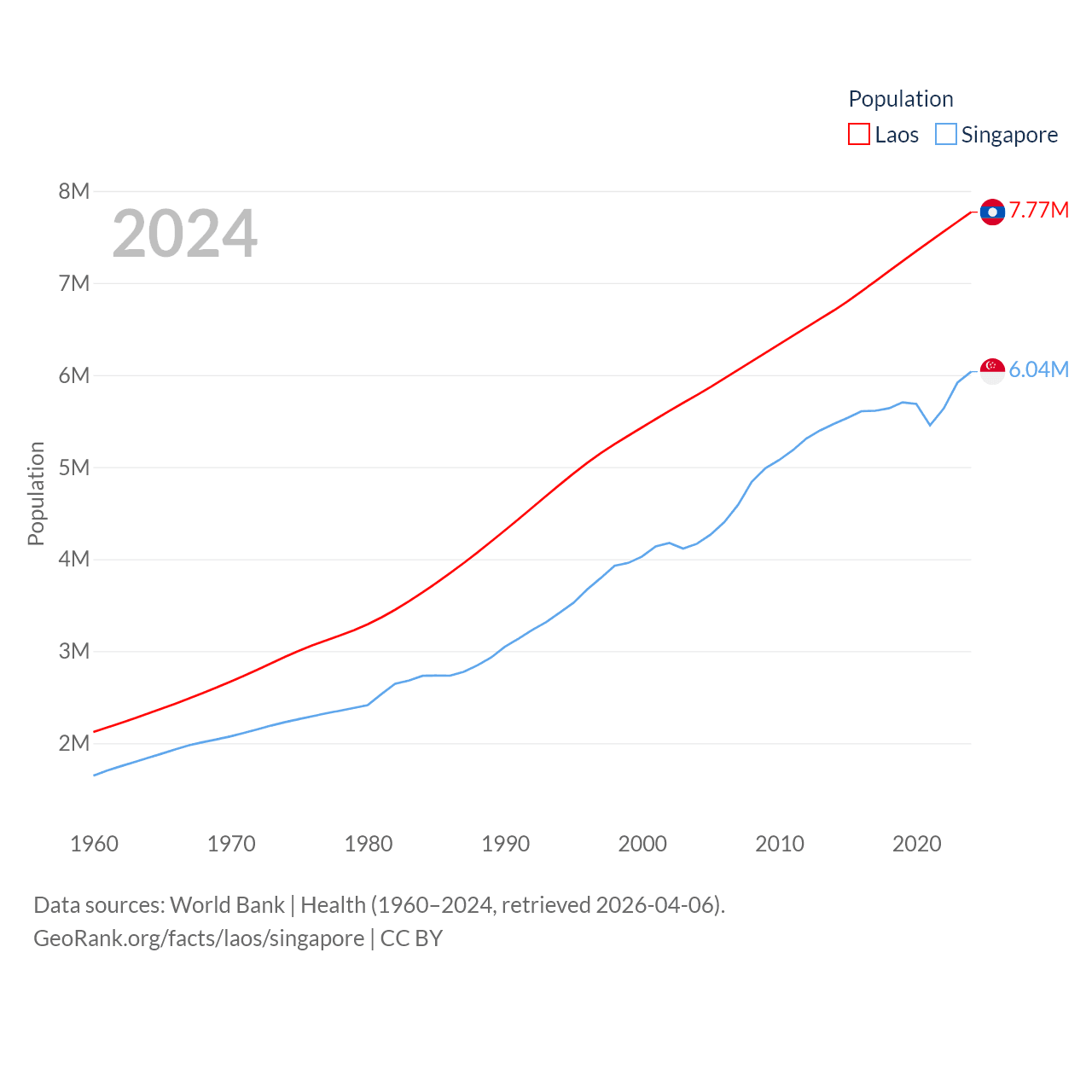 Laos has a population of 7.77M (ranked 103/197), compared with 6.04M in Singapore (ranked 113/197). Laos' land area is 89,112 sq mi versus 277.2 sq mi for Singapore (ranked 79th vs. 177th).