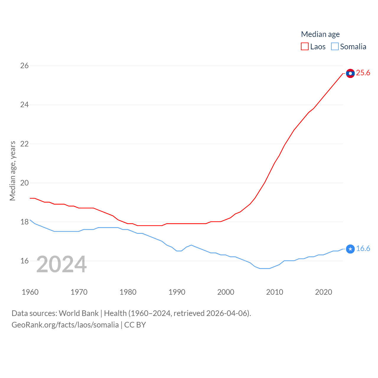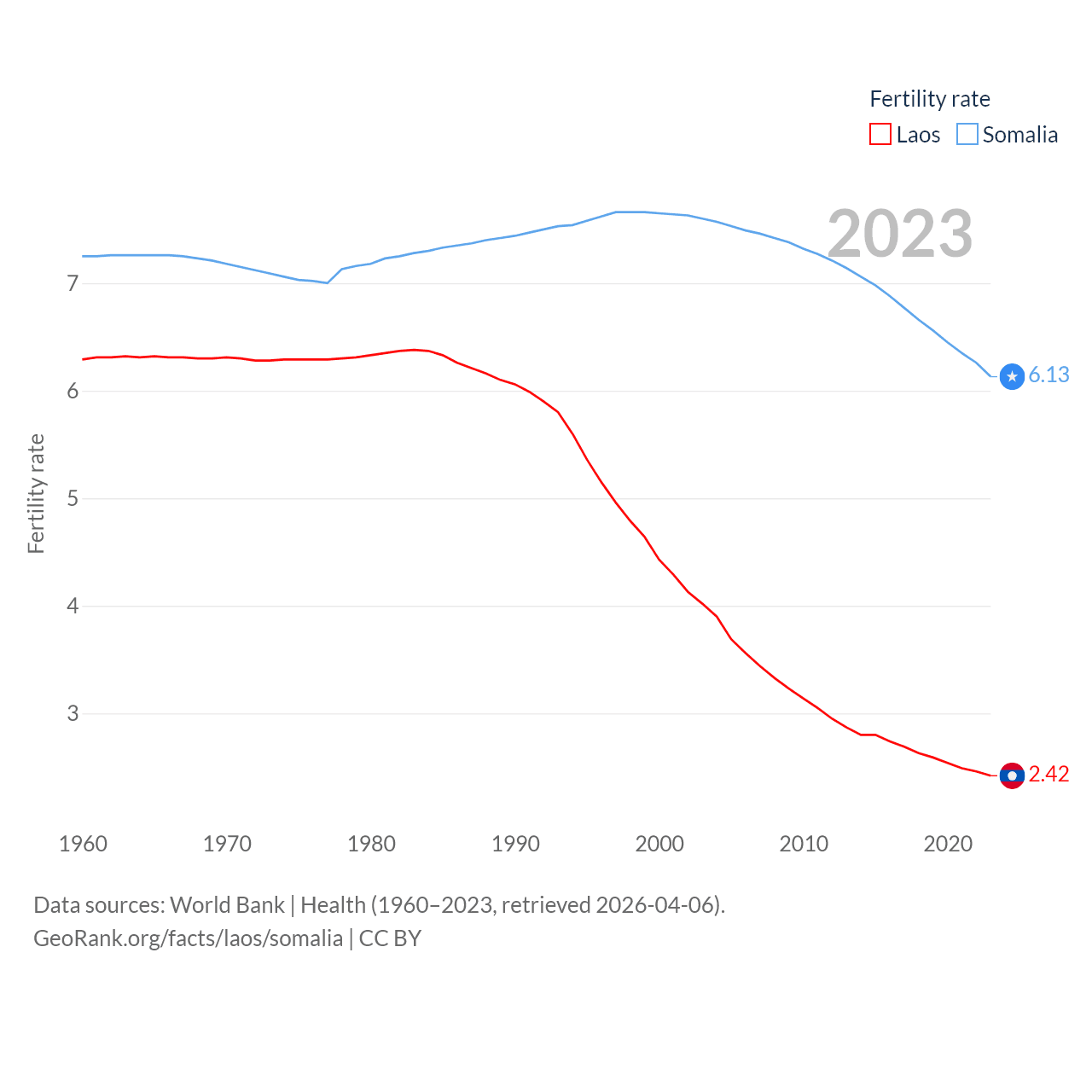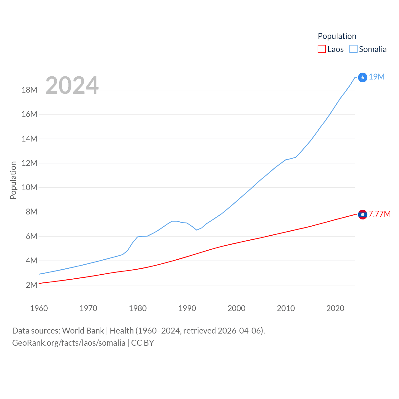 Laos has a population of 7.77M (ranked 103/197), compared with 19M in Somalia (ranked 68/197). Laos' land area is 89,112 sq mi versus 242,217 sq mi for Somalia (ranked 79th vs. 42nd).