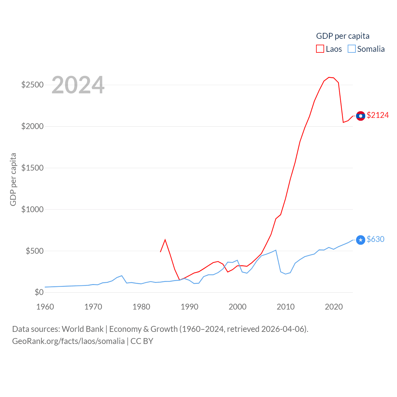 By GDP, Laos ranks 139/197 ($16.5B) and Somalia ranks 150/197 ($12B). By GDP per capita, Laos ranks 155/197 ($2,124), while Somalia ranks 192/197 ($630).