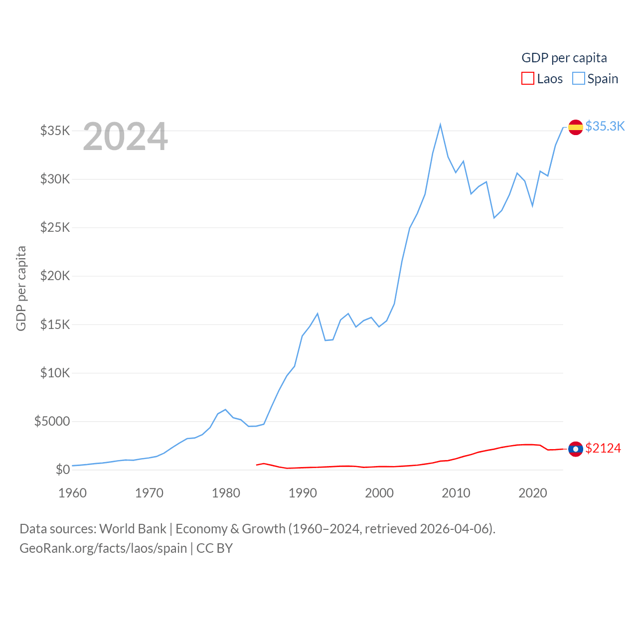 By GDP, Laos ranks 139/197 ($16.5B) and Spain ranks 15/197 ($1.73T). By GDP per capita, Laos ranks 155/197 ($2,124), while Spain ranks 32/197 ($35,327).