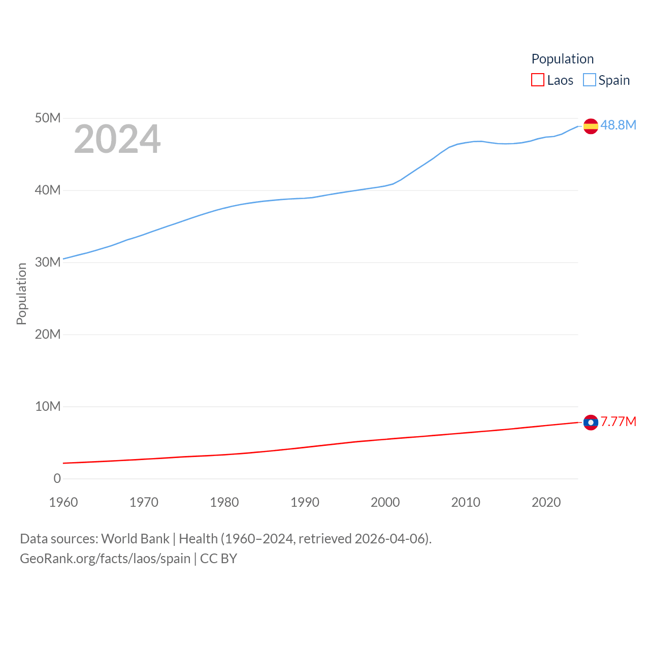 Laos has a population of 7.77M (ranked 103/197), compared with 48.8M in Spain (ranked 32/197). Laos' land area is 89,112 sq mi versus 192,934 sq mi for Spain (ranked 79th vs. 51st).