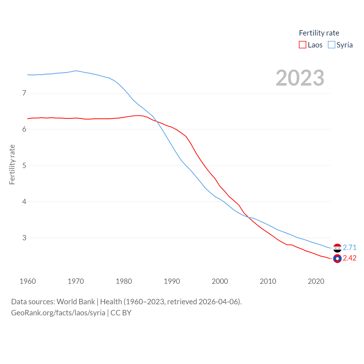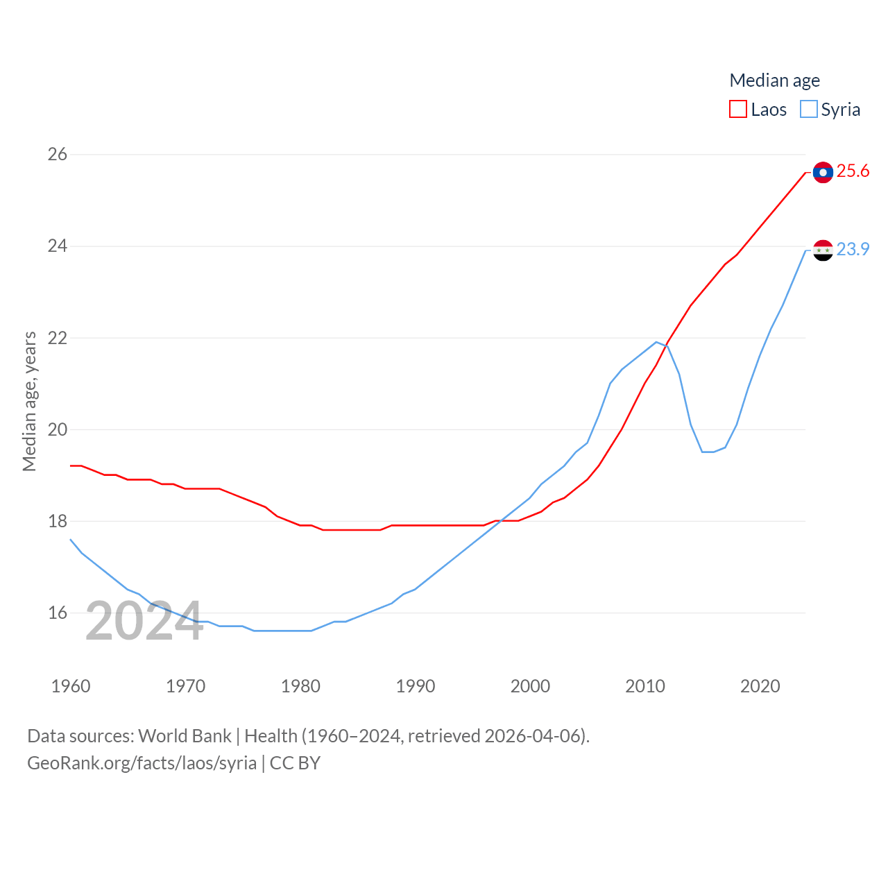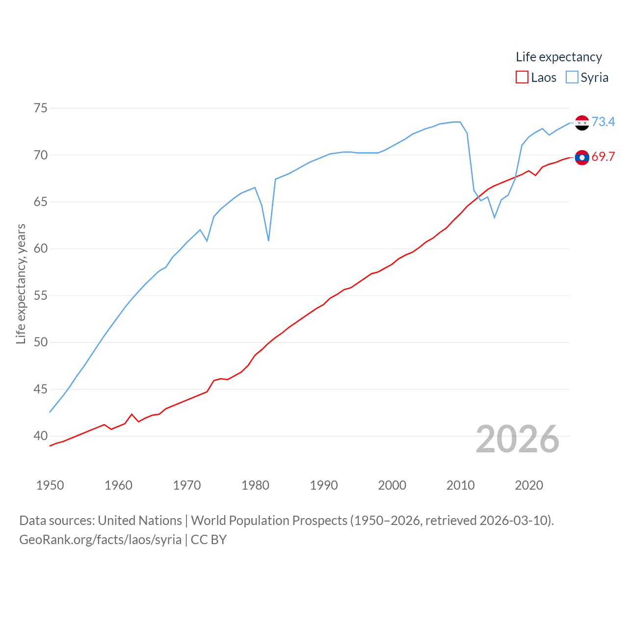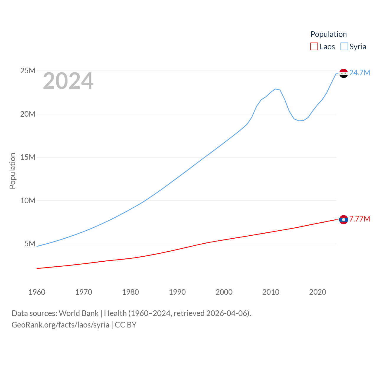 Laos has a population of 7.77M (ranked 103/197), compared with 24.7M in Syria (ranked 57/197). Laos' land area is 89,112 sq mi versus 70,900 sq mi for Syria (ranked 79th vs. 87th).