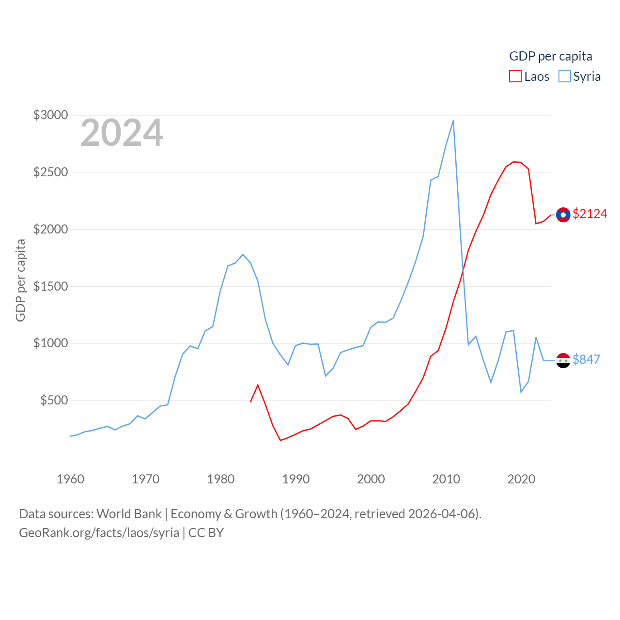 By GDP, Laos ranks 139/197 ($16.5B) and Syria ranks 129/197 ($20B). By GDP per capita, Laos ranks 155/197 ($2,124), while Syria ranks 185/197 ($847).