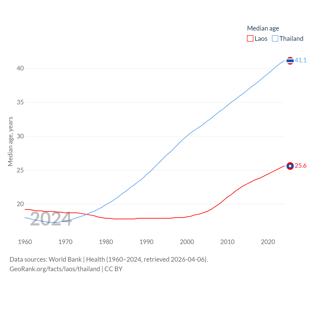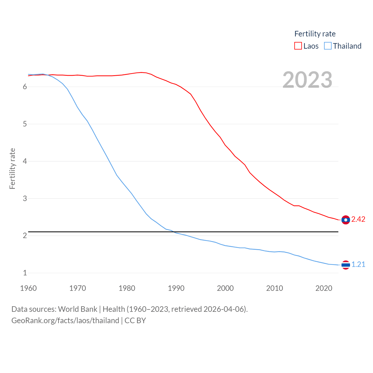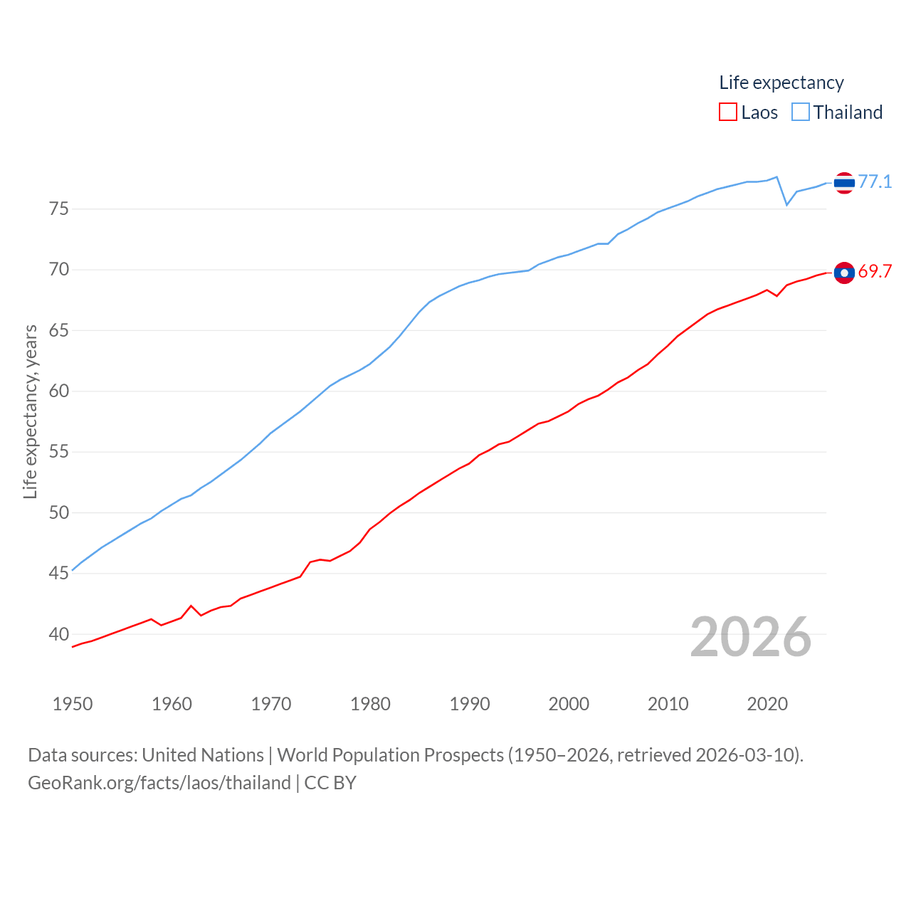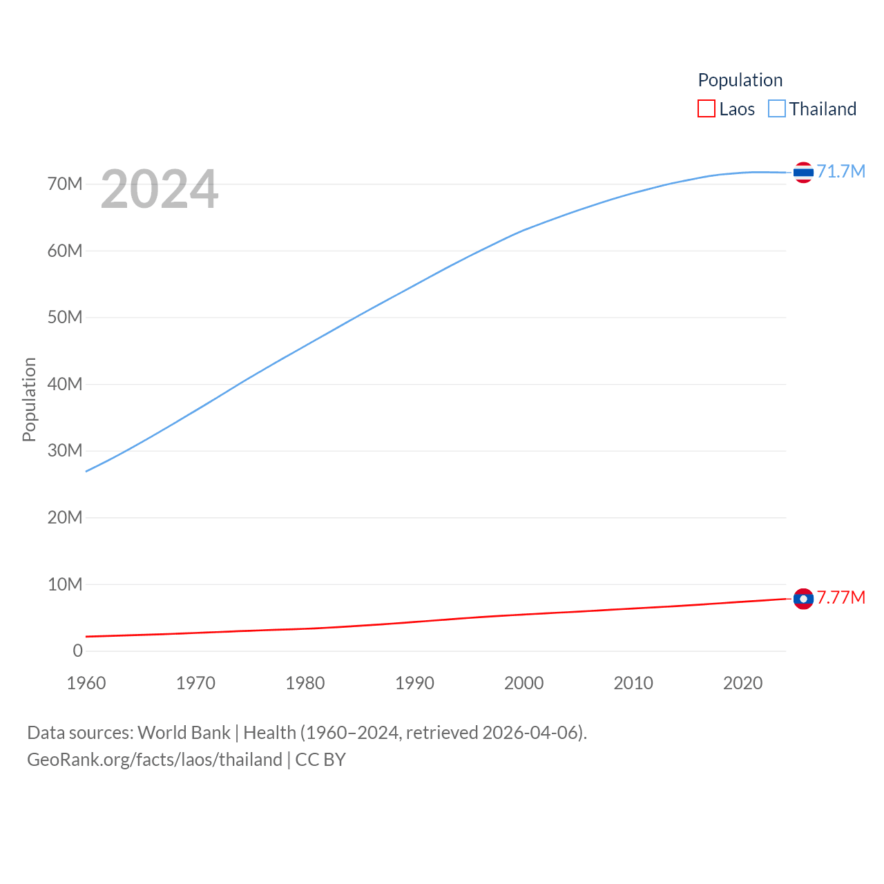 Laos has a population of 7.77M (ranked 103/197), compared with 71.7M in Thailand (ranked 20/197). Laos' land area is 89,112 sq mi versus 197,256 sq mi for Thailand (ranked 79th vs. 50th).