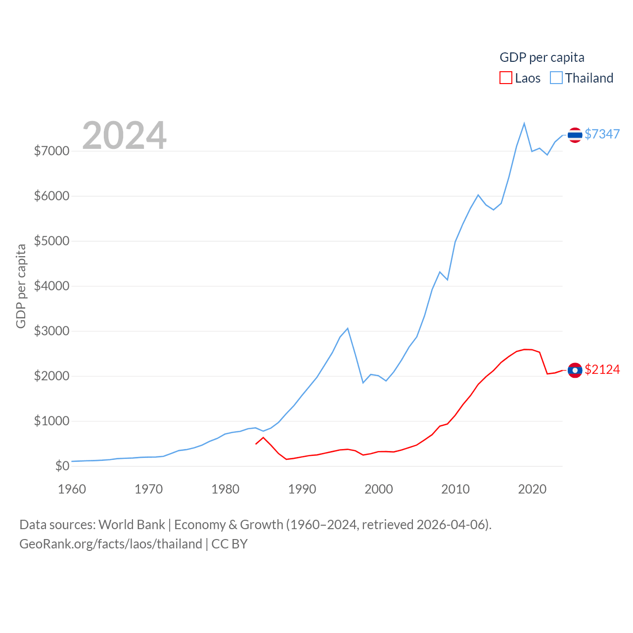 By GDP, Laos ranks 139/197 ($16.5B) and Thailand ranks 31/197 ($527B). By GDP per capita, Laos ranks 155/197 ($2,124), while Thailand ranks 100/197 ($7,347).