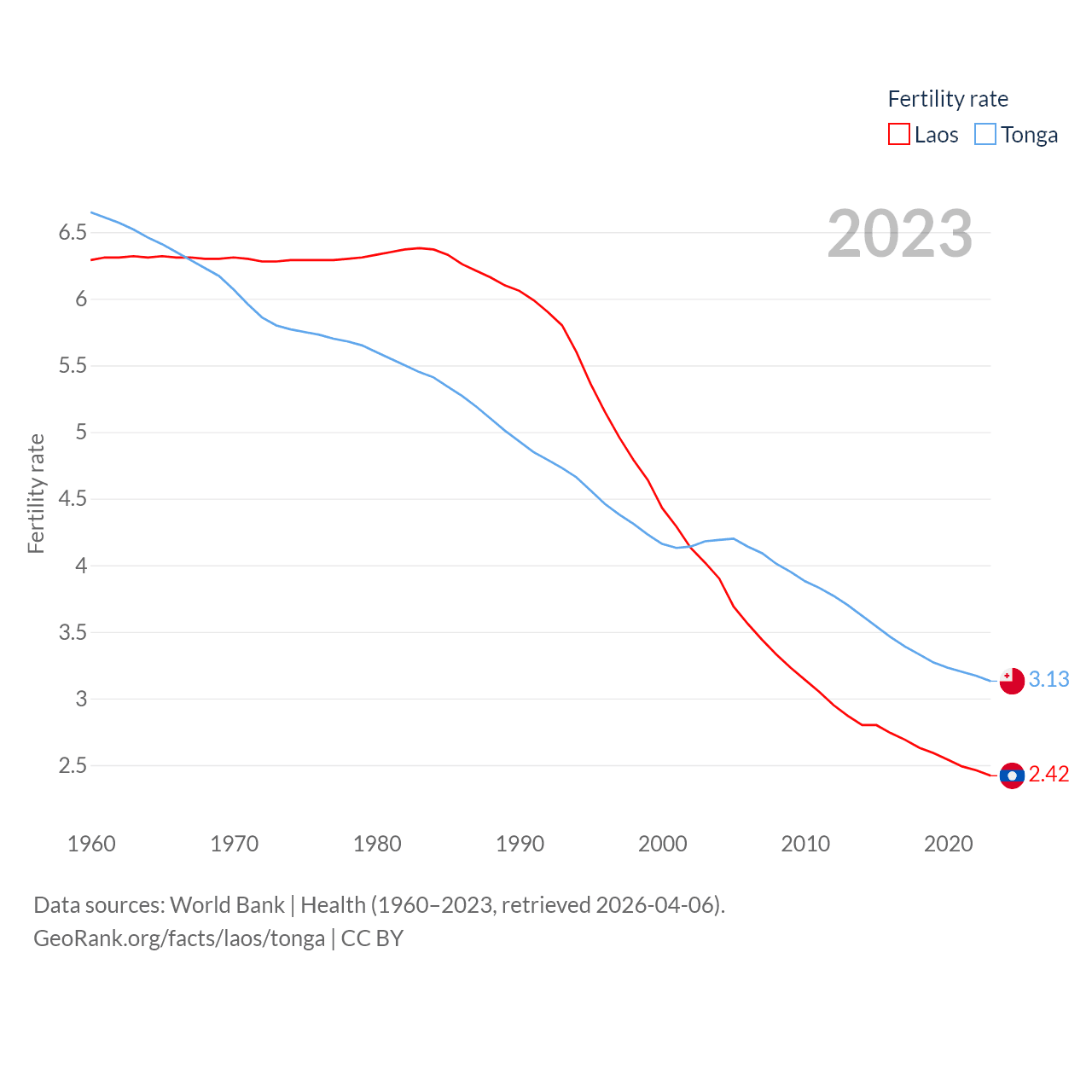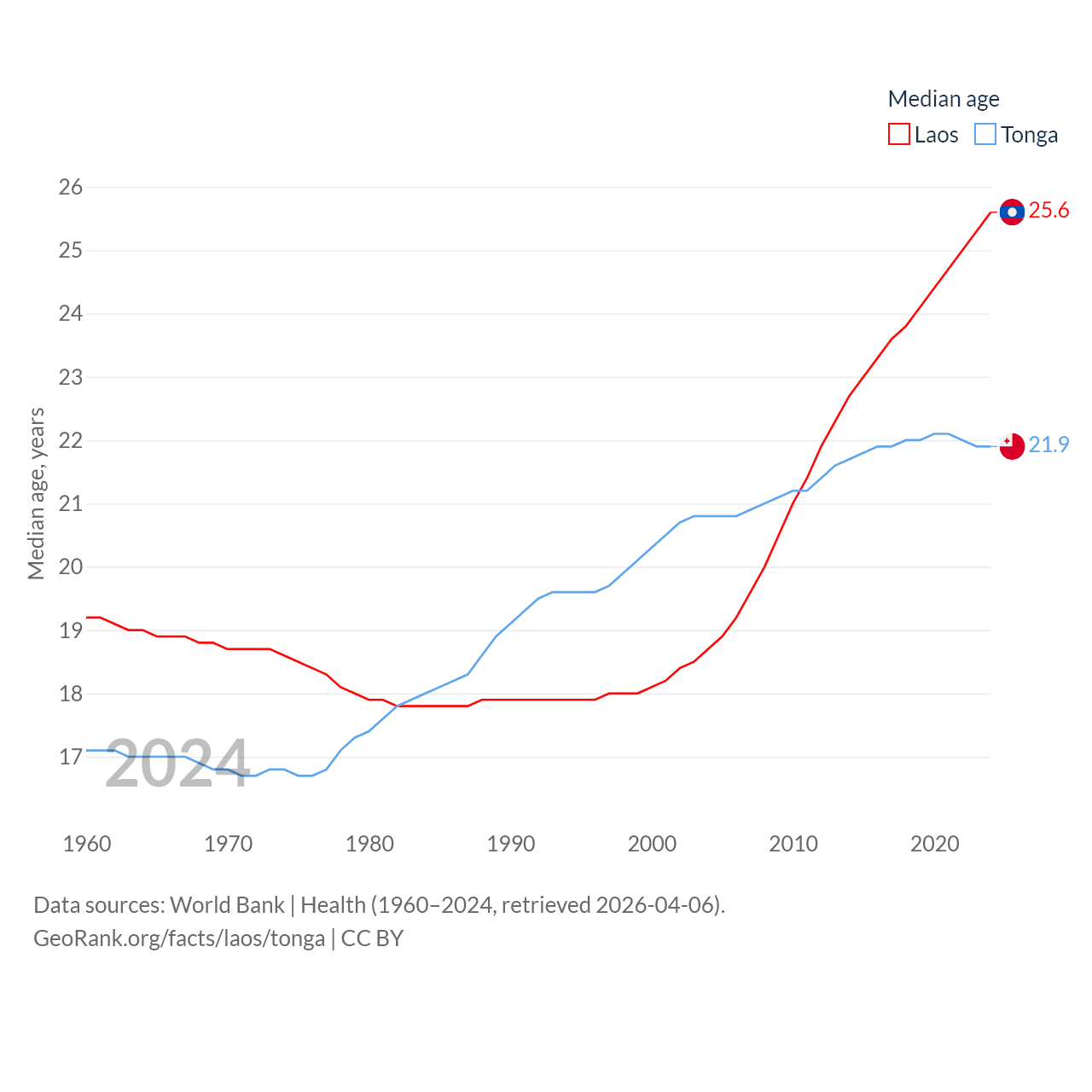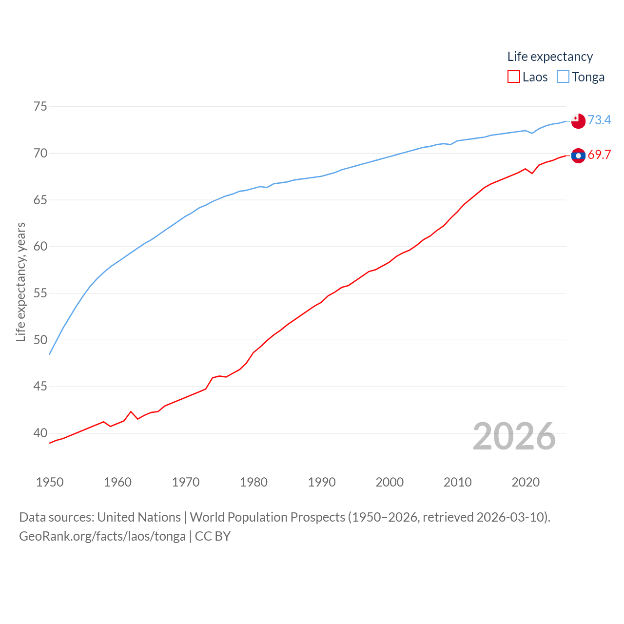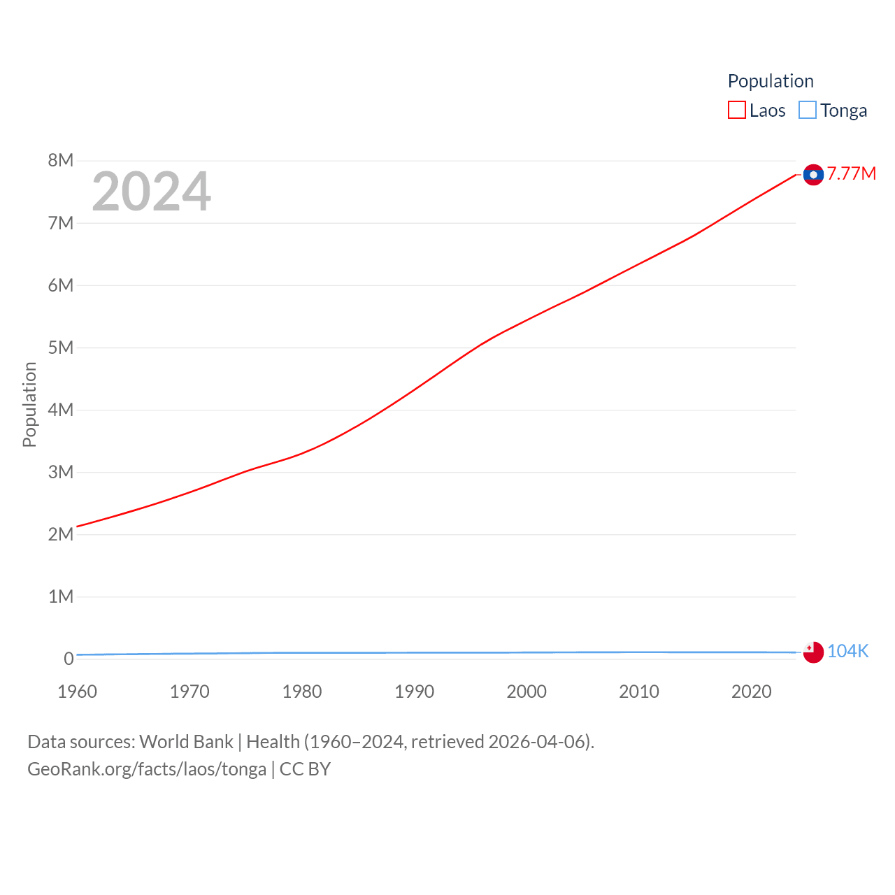 Laos has a population of 7.77M (ranked 103/197), compared with 104K in Tonga (ranked 183/197). Laos' land area is 89,112 sq mi versus 278 sq mi for Tonga (ranked 79th vs. 176th).