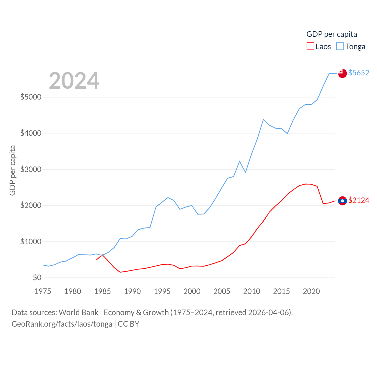 By GDP, Laos ranks 139/197 ($16.5B) and Tonga ranks 191/197 ($591M). By GDP per capita, Laos ranks 155/197 ($2,124), while Tonga ranks 115/197 ($5,652).
