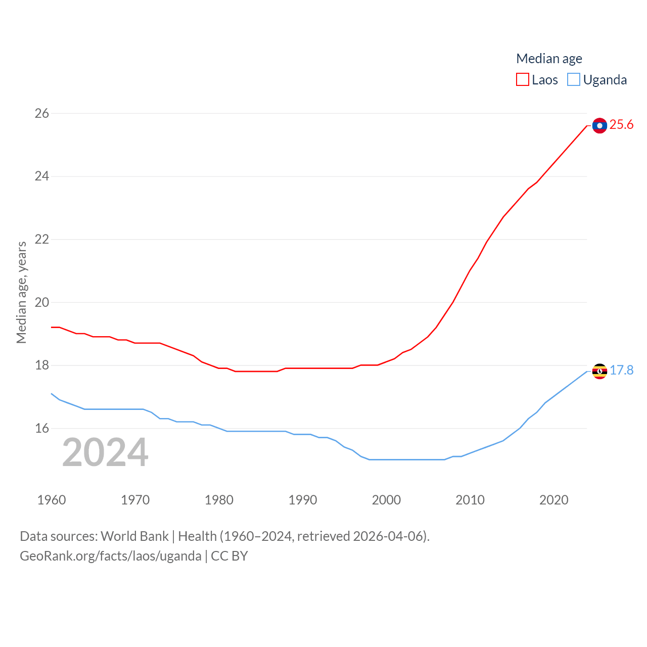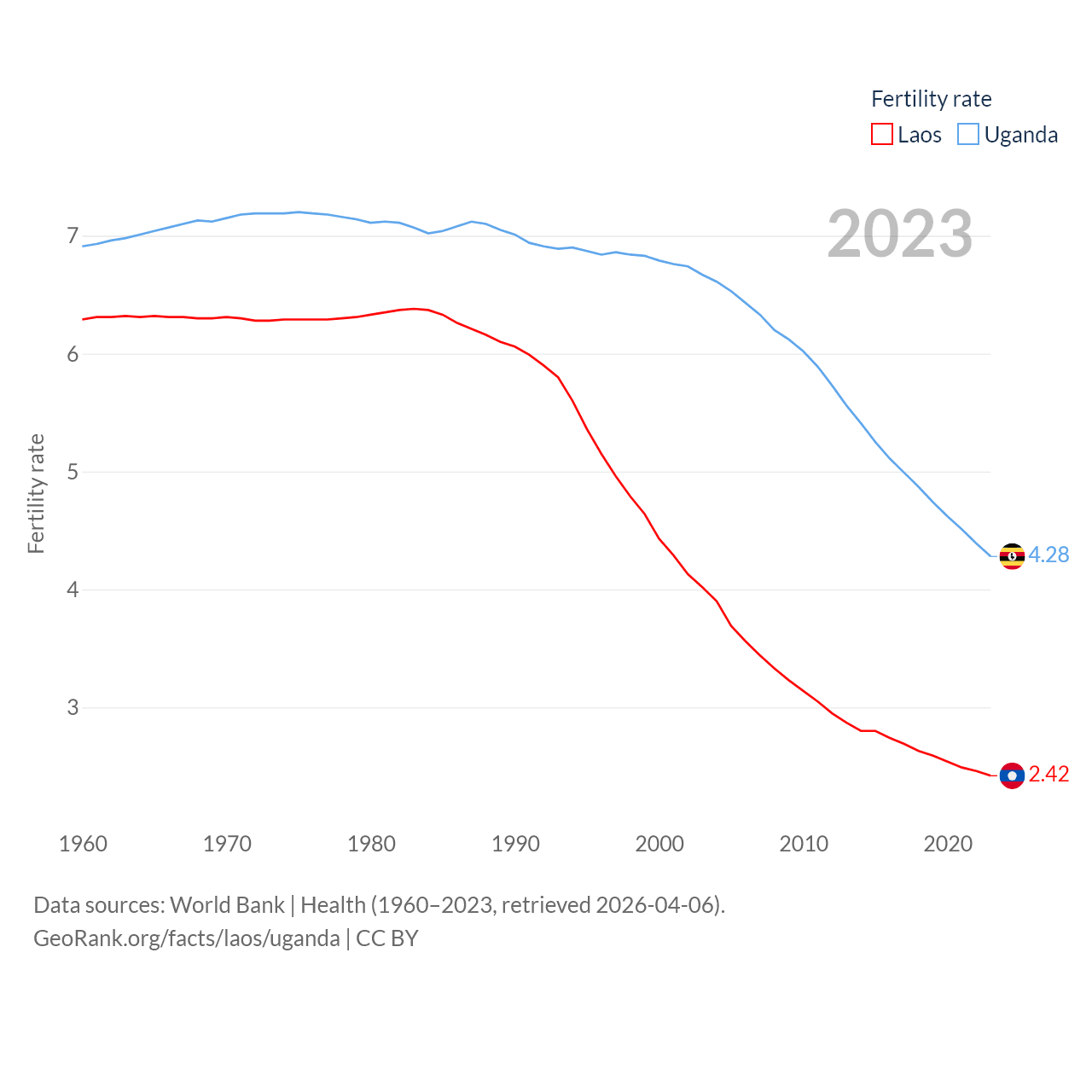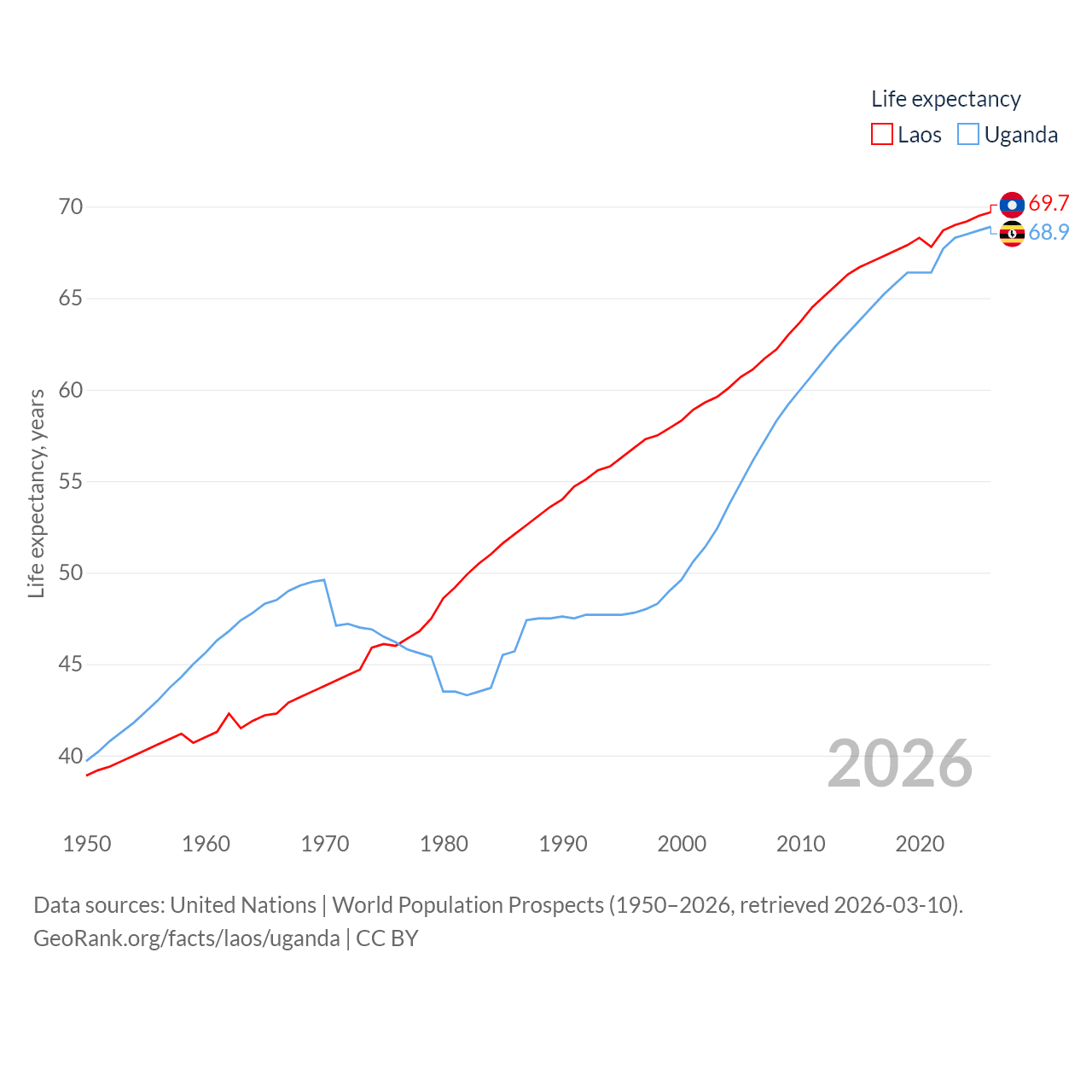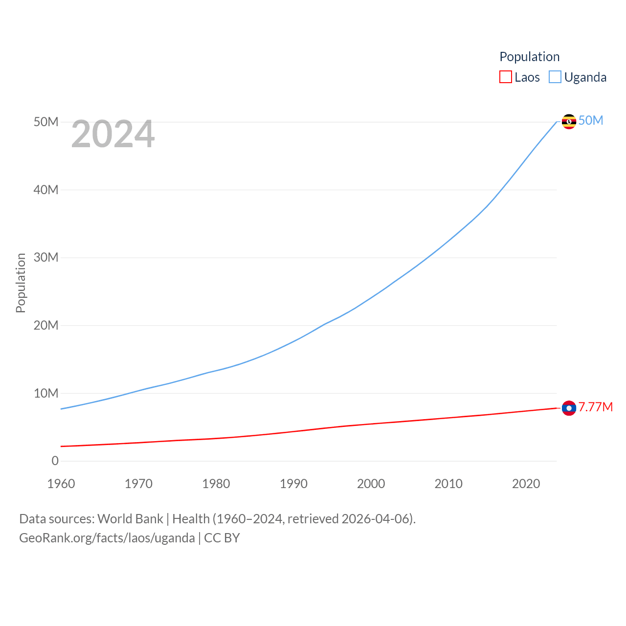 Laos has a population of 7.77M (ranked 103/197), compared with 50M in Uganda (ranked 31/197). Laos' land area is 89,112 sq mi versus 77,421 sq mi for Uganda (ranked 79th vs. 84th).