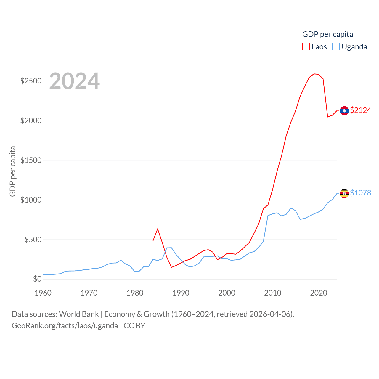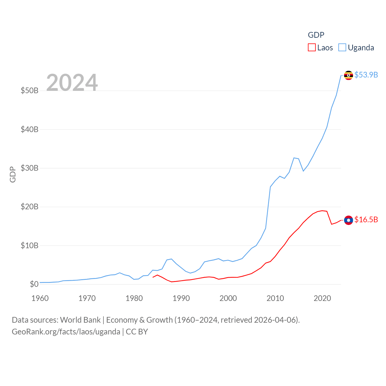 By GDP, Laos ranks 139/197 ($16.5B) and Uganda ranks 89/197 ($53.9B). By GDP per capita, Laos ranks 155/197 ($2,124), while Uganda ranks 176/197 ($1,078).