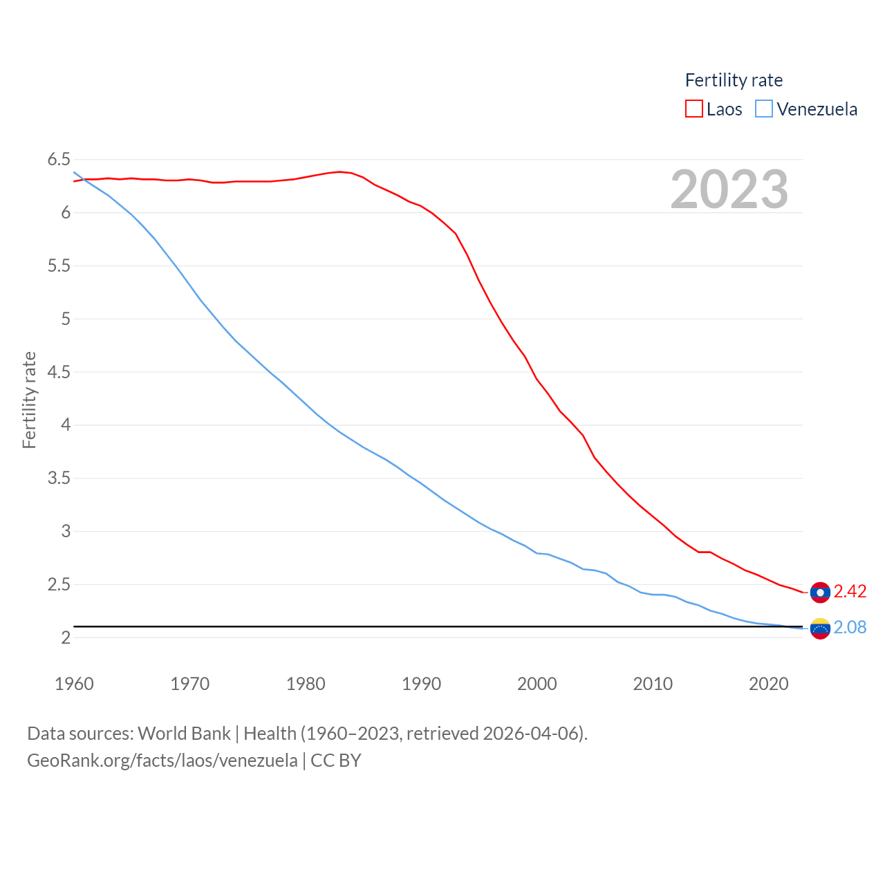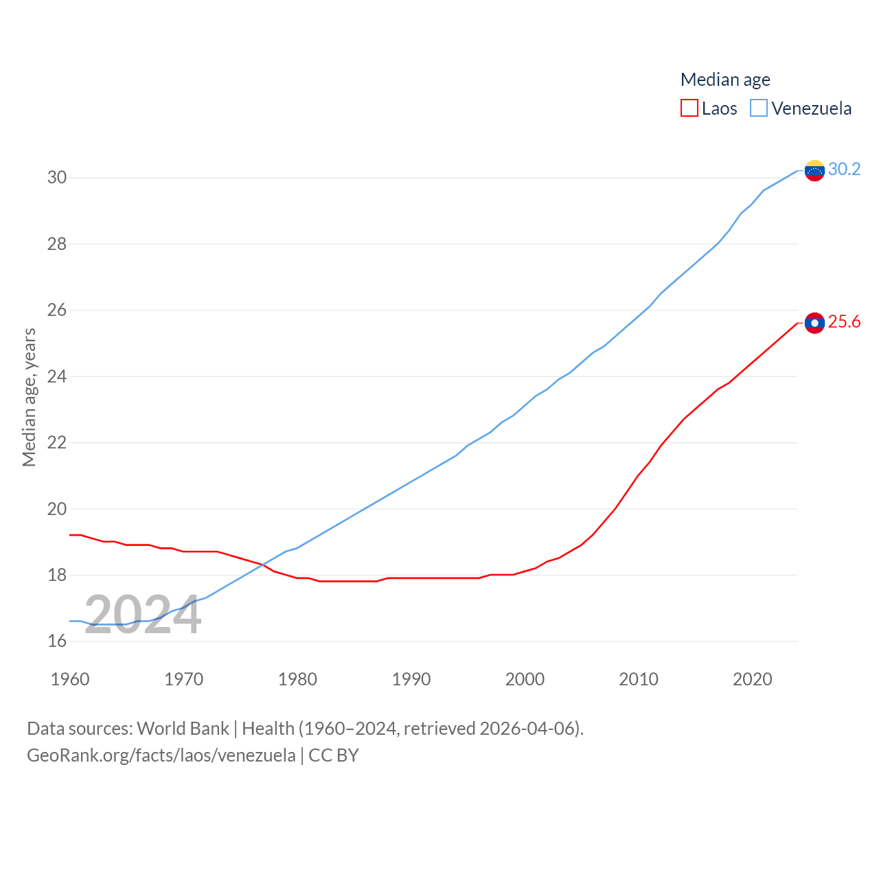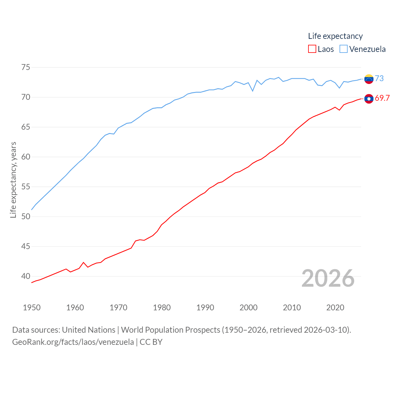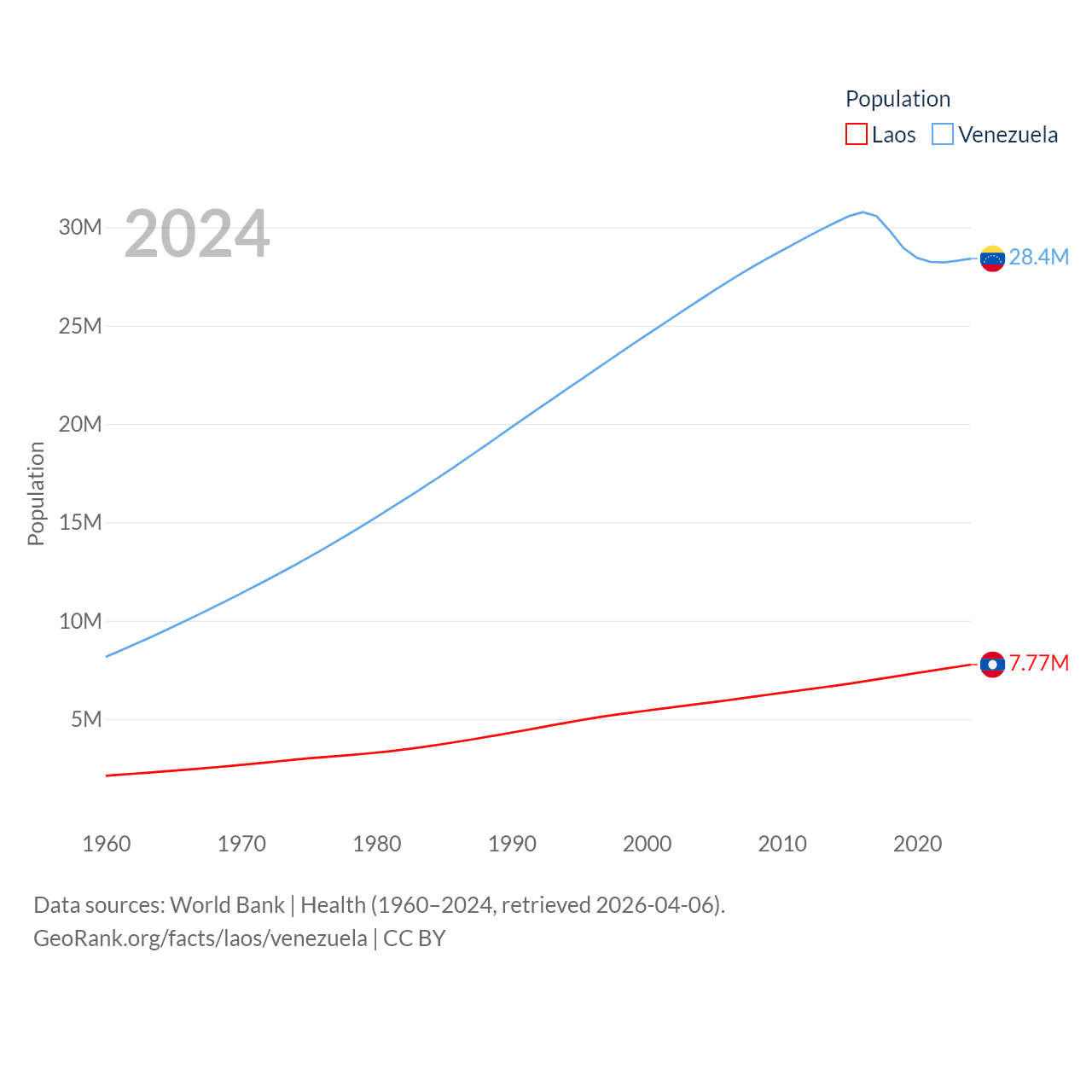 Laos has a population of 7.77M (ranked 103/197), compared with 28.4M in Venezuela (ranked 53/197). Laos' land area is 89,112 sq mi versus 340,561 sq mi for Venezuela (ranked 79th vs. 32nd).