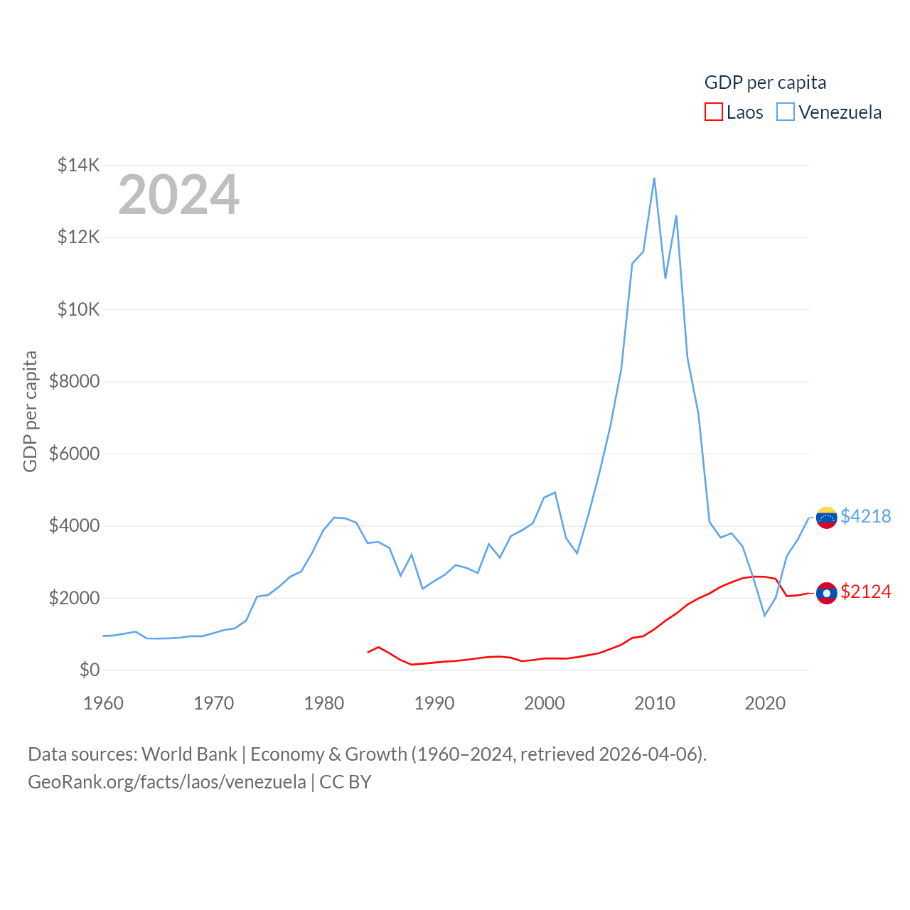 By GDP, Laos ranks 139/197 ($16.5B) and Venezuela ranks 65/197 ($120B). By GDP per capita, Laos ranks 155/197 ($2,124), while Venezuela ranks 128/197 ($4,218).