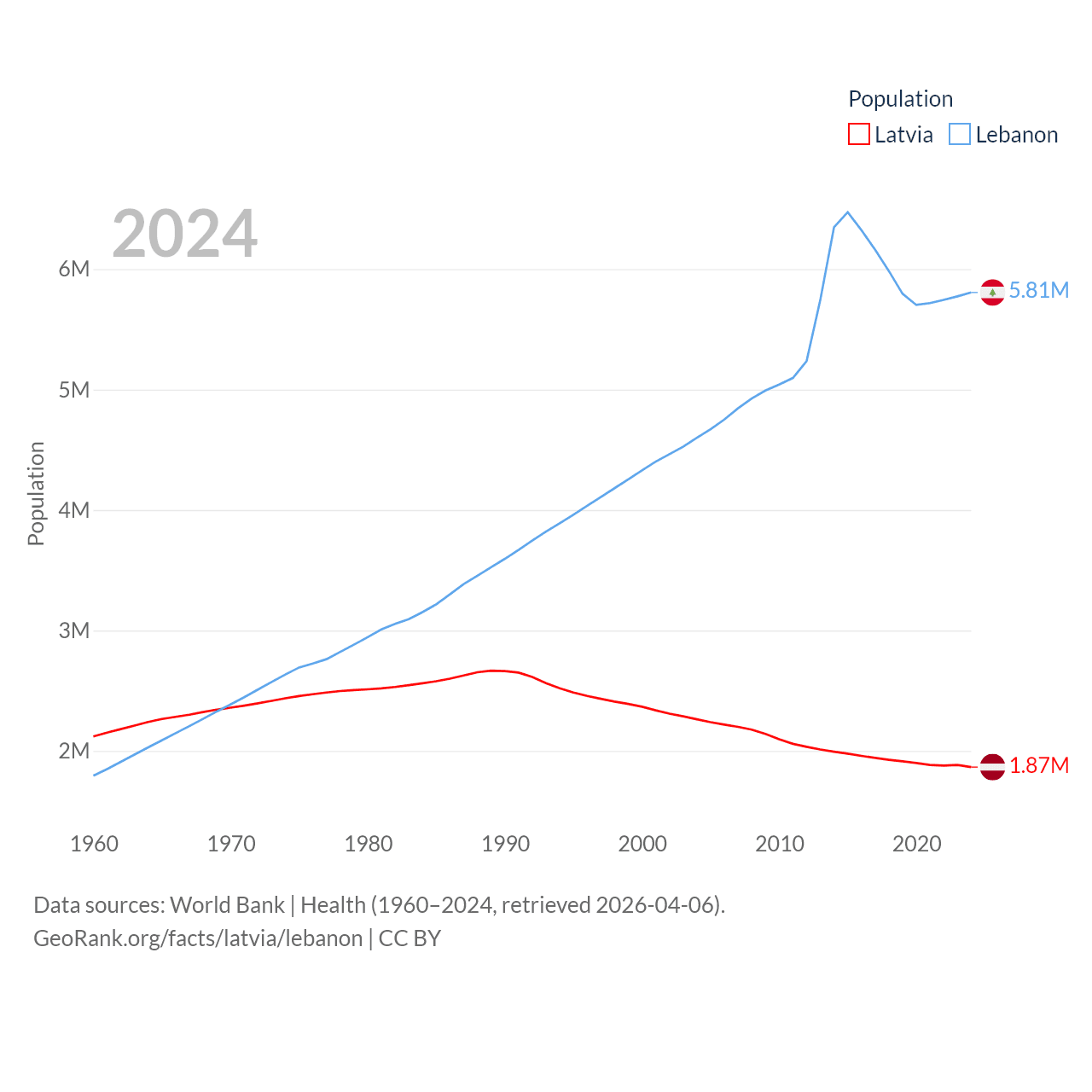 Latvia has a population of 1.87M (ranked 149/197), compared with 5.81M in Lebanon (ranked 115/197). Latvia's land area is 24,027 sq mi versus 3,950 sq mi for Lebanon (ranked 121st vs. 160th).