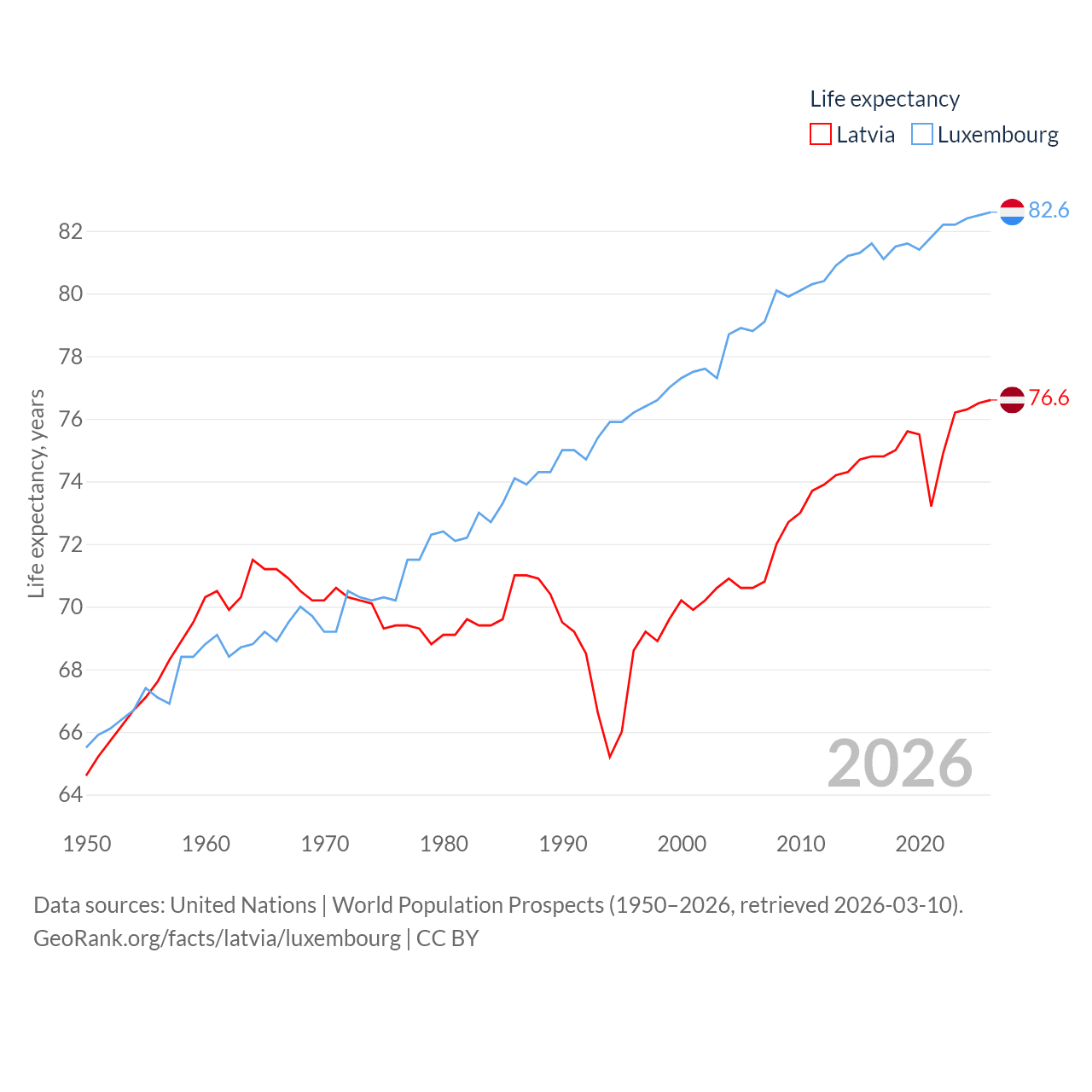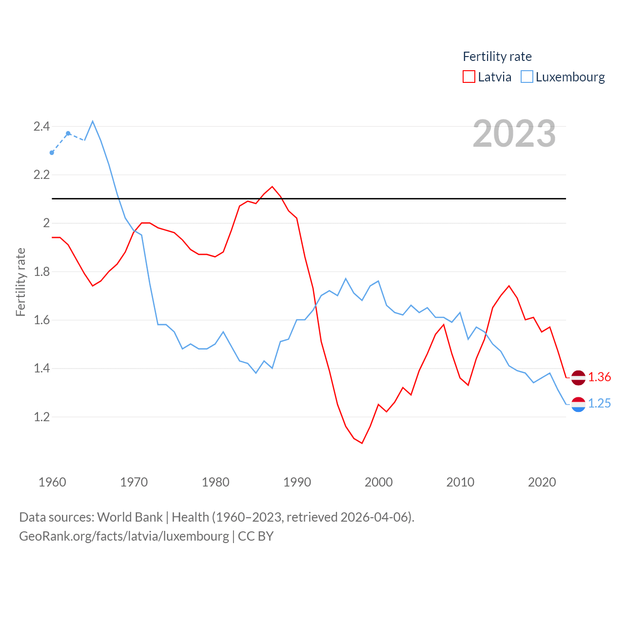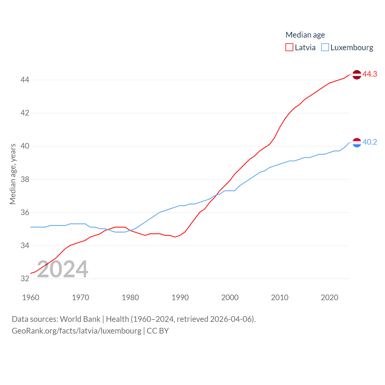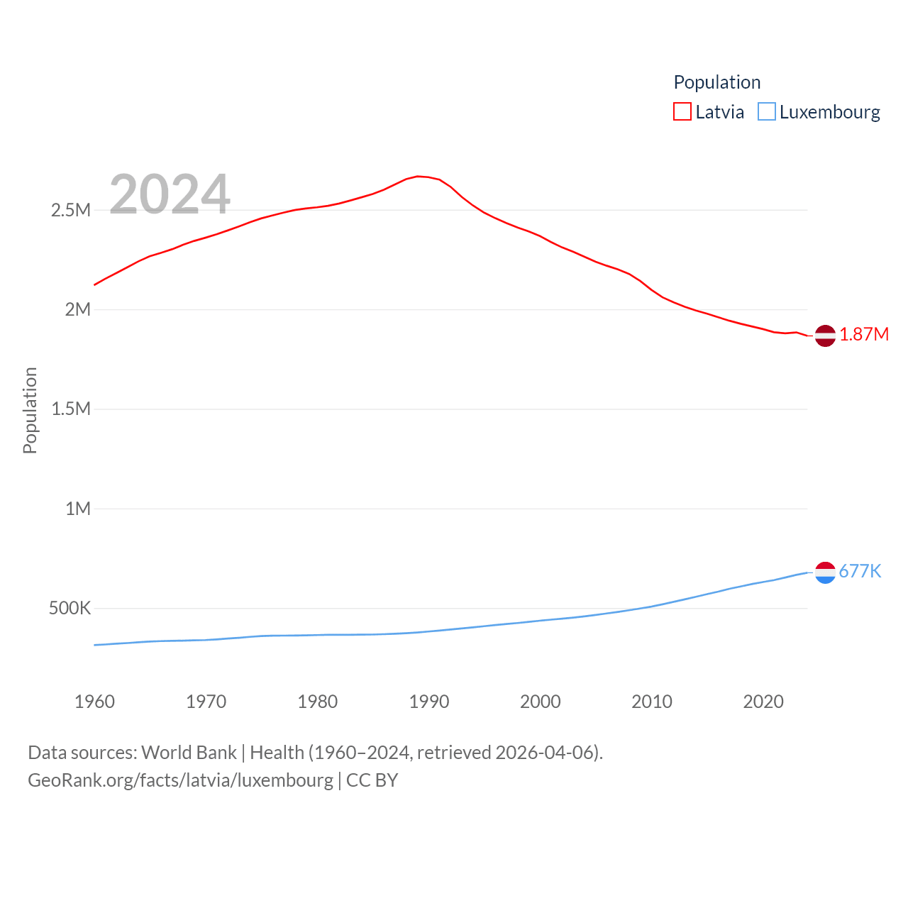 Latvia has a population of 1.87M (ranked 149/197), compared with 677K in Luxembourg (ranked 164/197). Latvia's land area is 24,027 sq mi versus 994 sq mi for Luxembourg (ranked 121st vs. 169th).