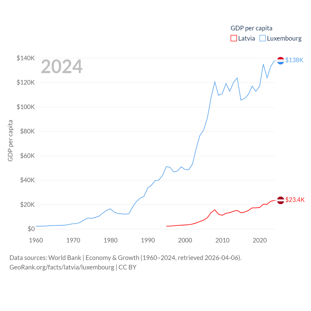 By GDP, Latvia ranks 99/197 ($43.7B) and Luxembourg ranks 74/197 ($93.3B). By GDP per capita, Latvia ranks 54/197 ($23,409), while Luxembourg ranks 3/197 ($137,782).