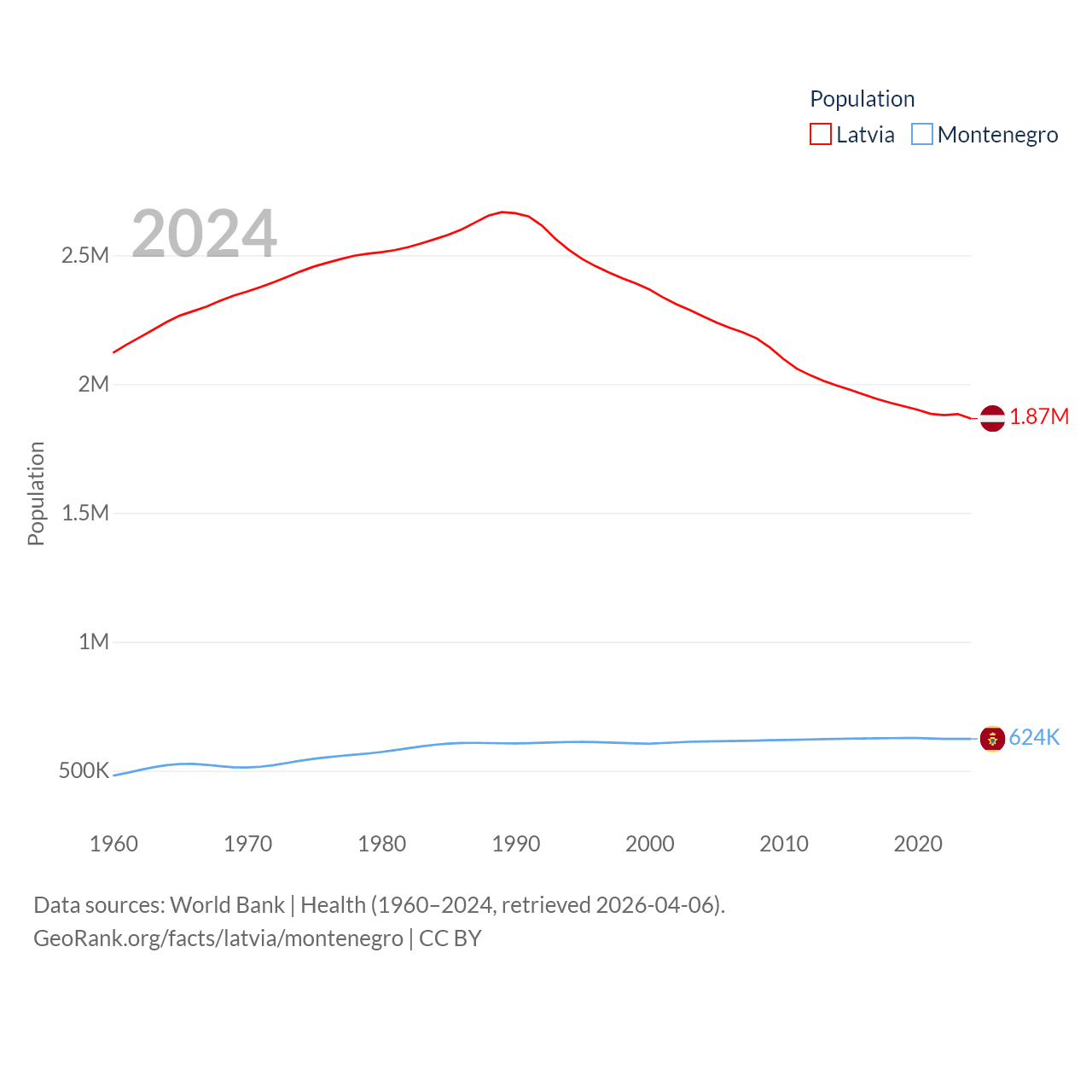 Latvia has a population of 1.87M (ranked 149/197), compared with 624K in Montenegro (ranked 166/197). Latvia's land area is 24,027 sq mi versus 5,193 sq mi for Montenegro (ranked 121st vs. 156th).