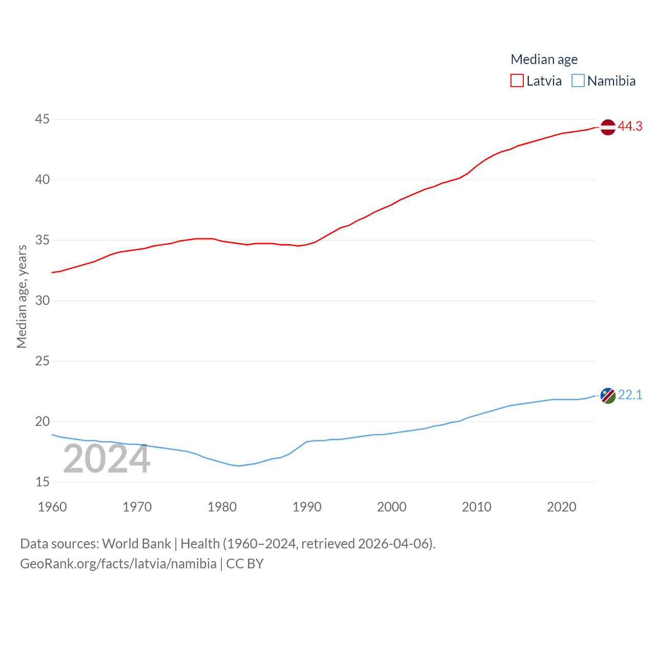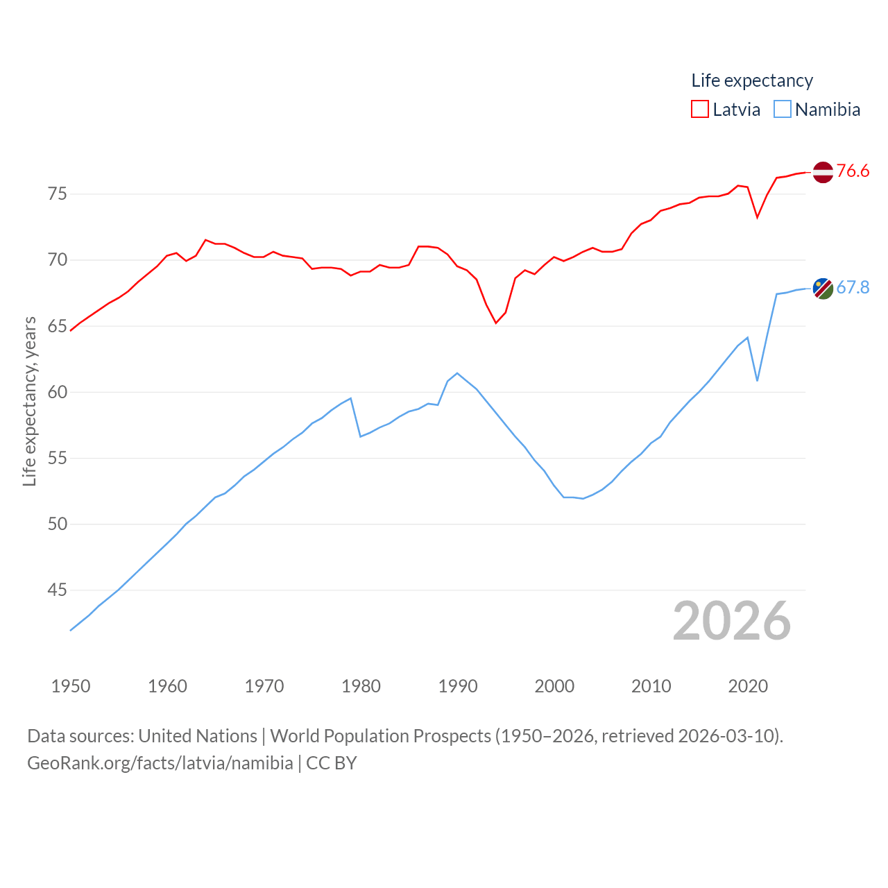 Latvia has a population of 1.87M (ranked 149/197), compared with 3.03M in Namibia (ranked 136/197). Latvia's land area is 24,027 sq mi versus 317,874 sq mi for Namibia (ranked 121st vs. 33rd).