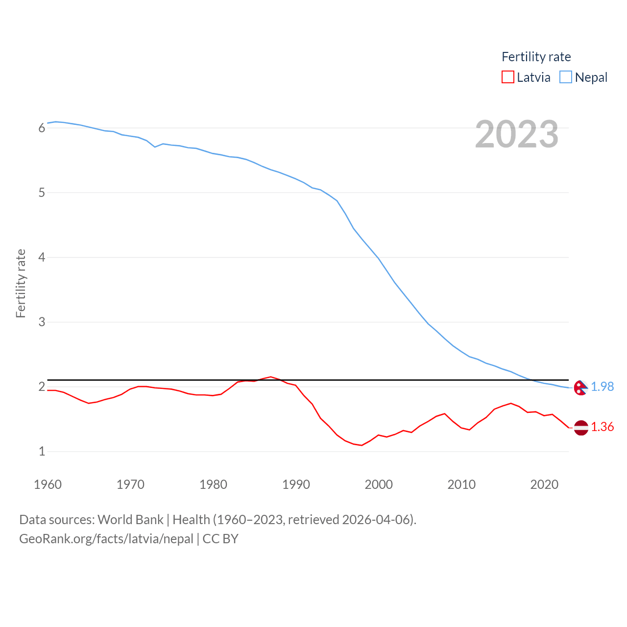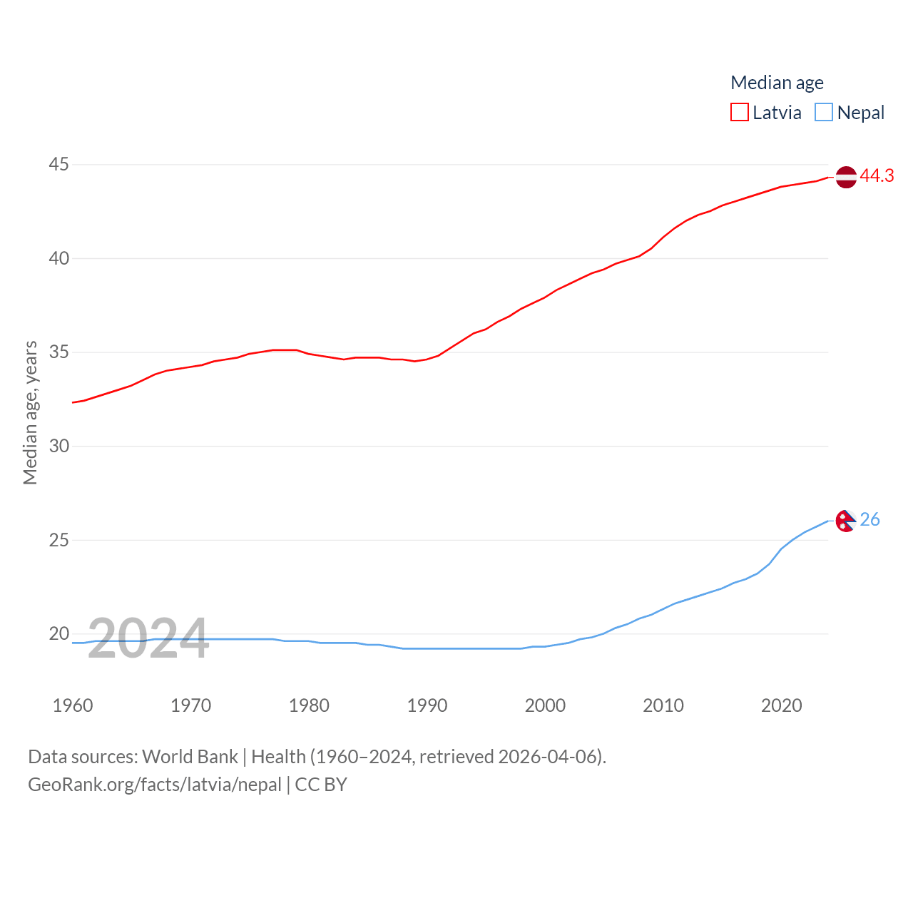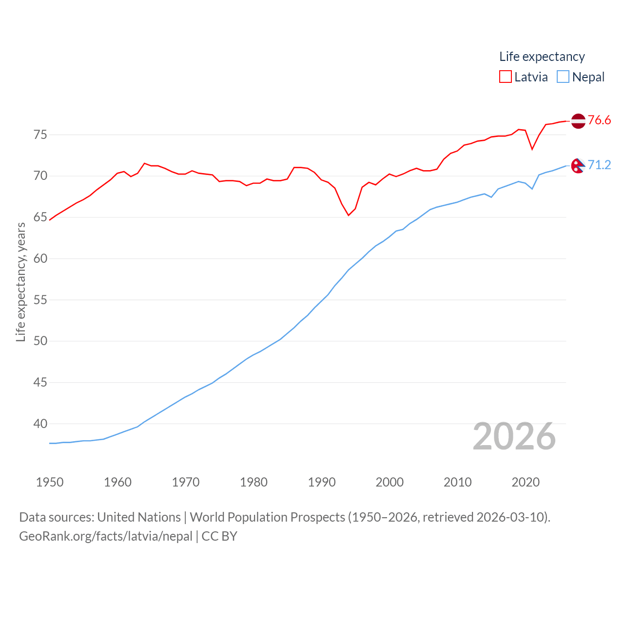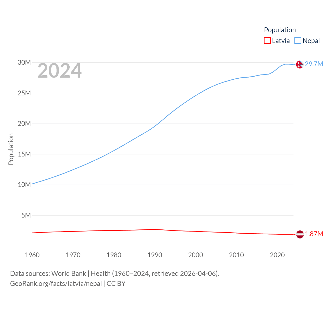 Latvia has a population of 1.87M (ranked 149/197), compared with 29.7M in Nepal (ranked 51/197). Latvia's land area is 24,027 sq mi versus 55,348 sq mi for Nepal (ranked 121st vs. 92nd).