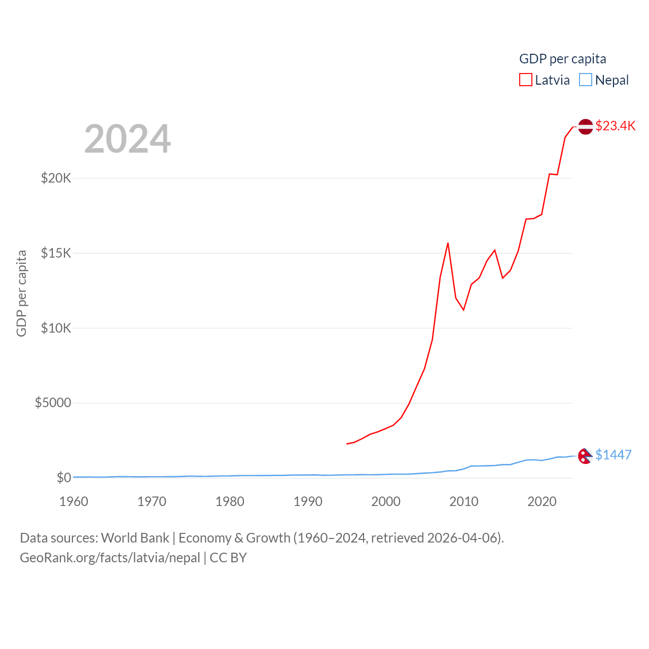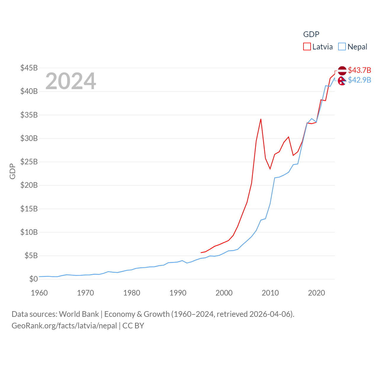 By GDP, Latvia ranks 99/197 ($43.7B) and Nepal ranks 101/197 ($42.9B). By GDP per capita, Latvia ranks 54/197 ($23,409), while Nepal ranks 164/197 ($1,447).