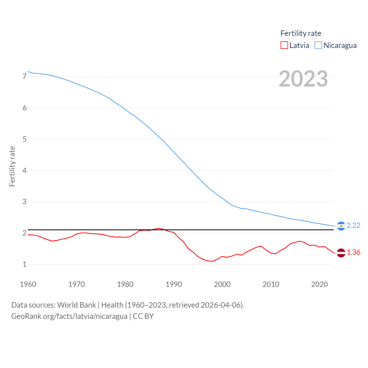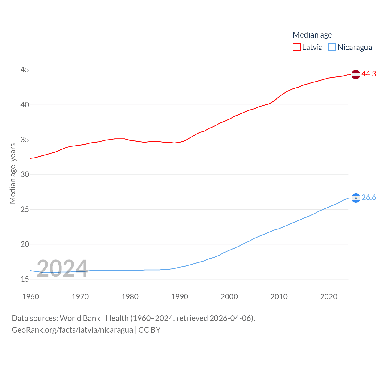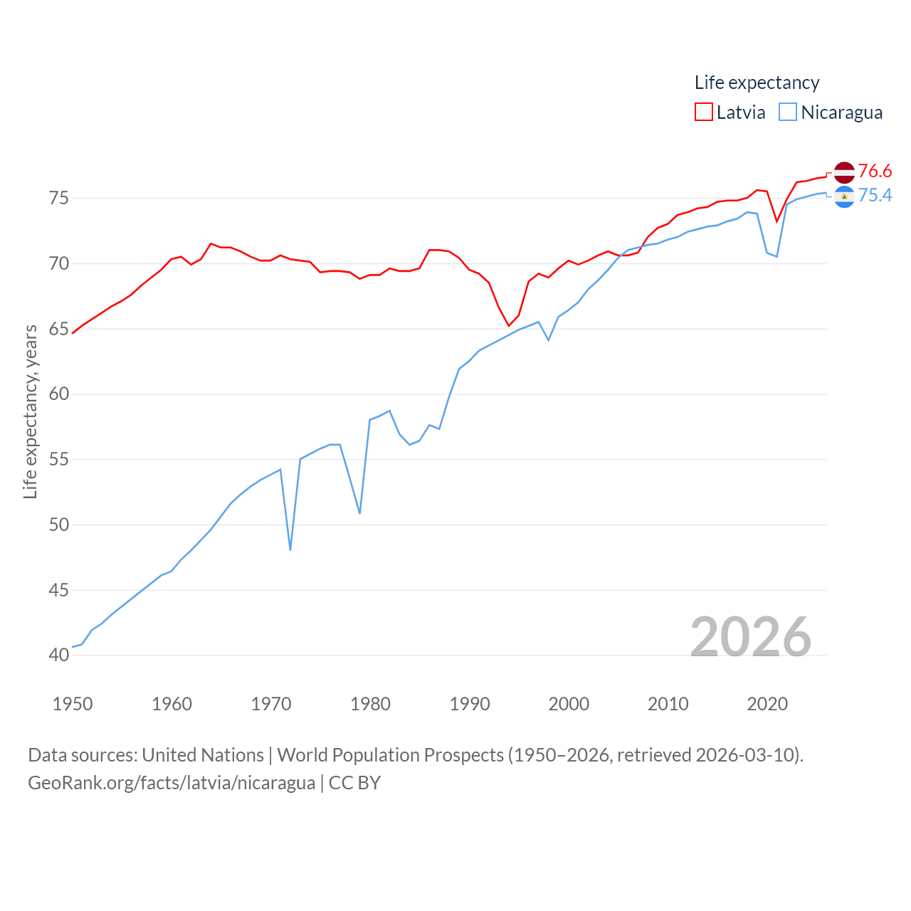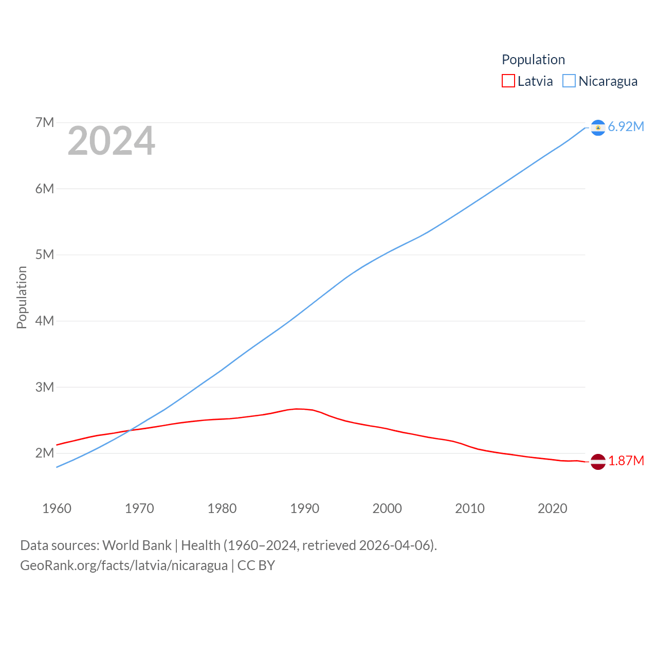 Latvia has a population of 1.87M (ranked 149/197), compared with 6.92M in Nicaragua (ranked 108/197). Latvia's land area is 24,027 sq mi versus 46,464 sq mi for Nicaragua (ranked 121st vs. 98th).