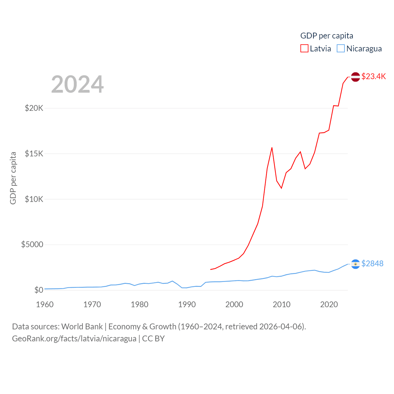 By GDP, Latvia ranks 99/197 ($43.7B) and Nicaragua ranks 131/197 ($19.7B). By GDP per capita, Latvia ranks 54/197 ($23,409), while Nicaragua ranks 141/197 ($2,848).