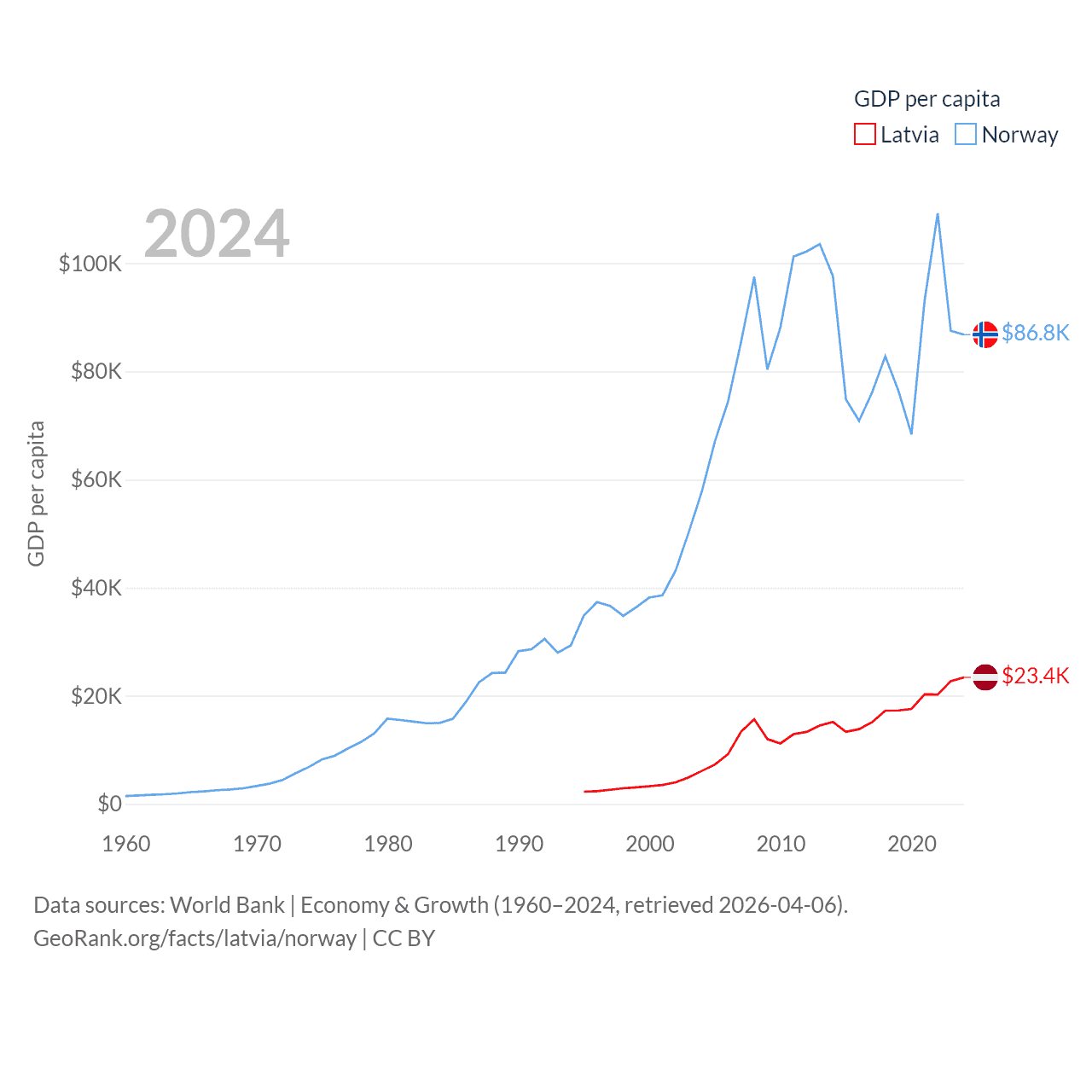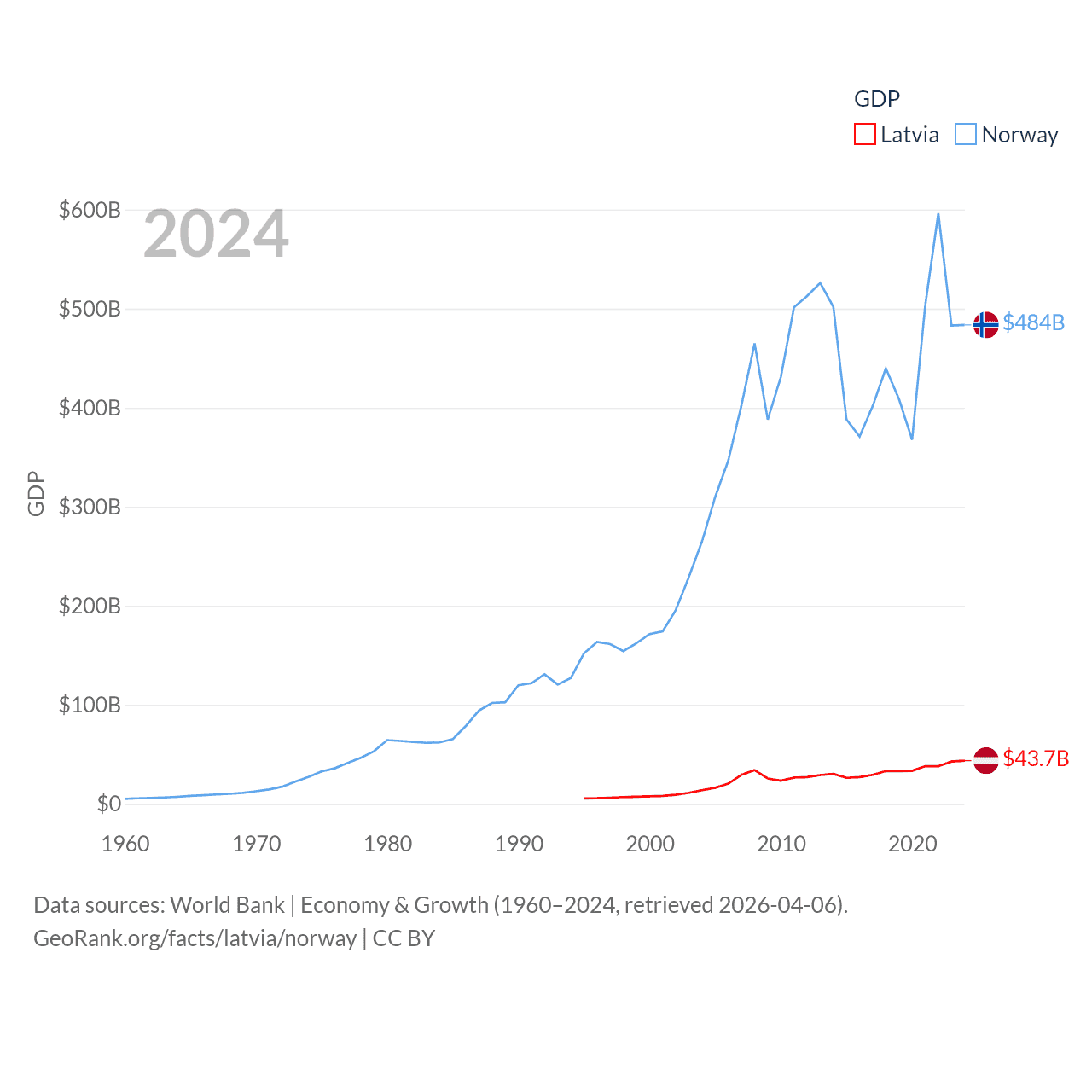 By GDP, Latvia ranks 99/197 ($43.7B) and Norway ranks 32/197 ($484B). By GDP per capita, Latvia ranks 54/197 ($23,409), while Norway ranks 8/197 ($86,785).