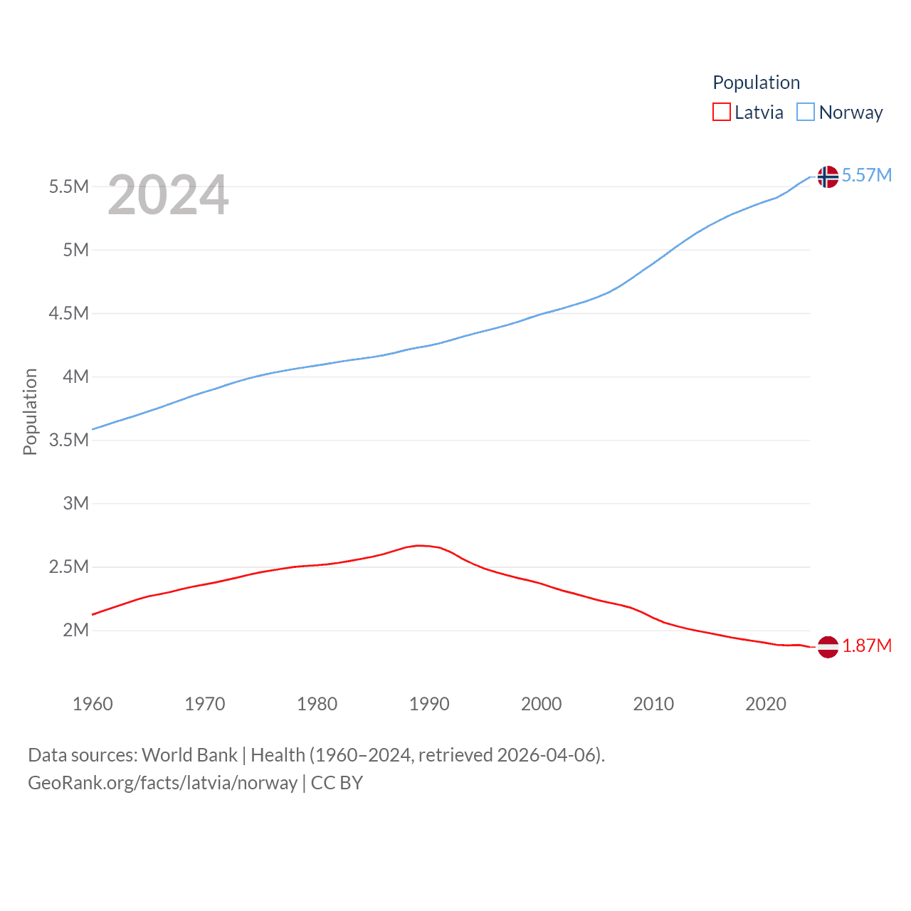 Latvia has a population of 1.87M (ranked 149/197), compared with 5.57M in Norway (ranked 118/197). Latvia's land area is 24,027 sq mi versus 140,645 sq mi for Norway (ranked 121st vs. 62nd).