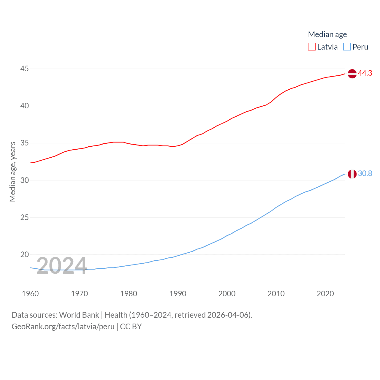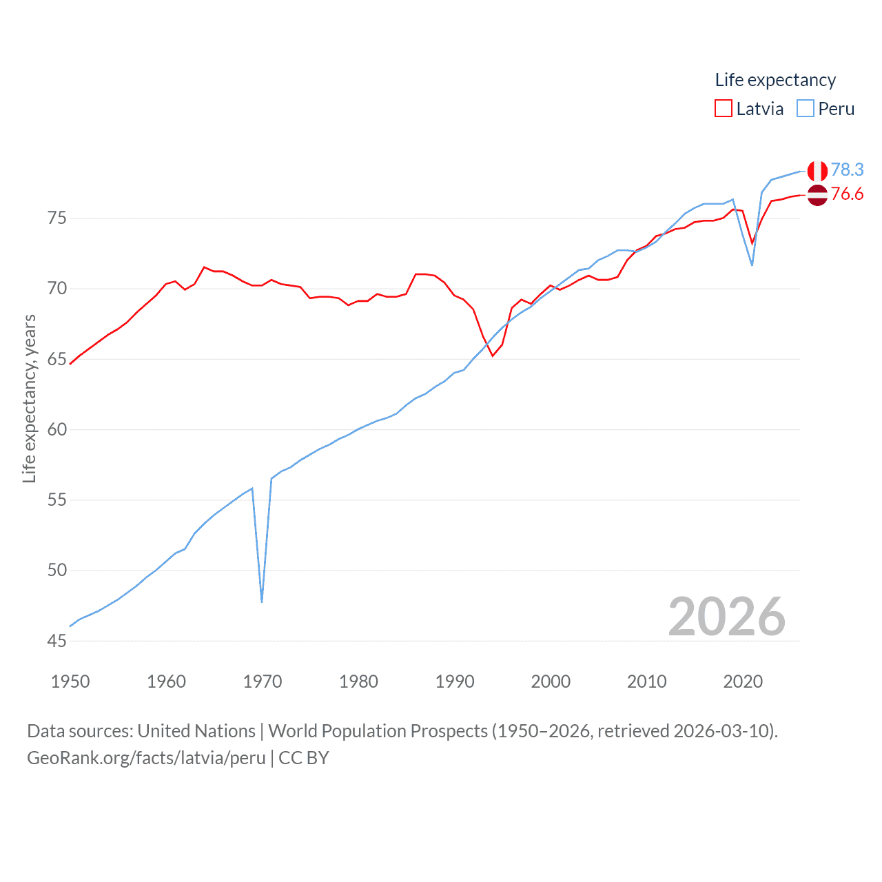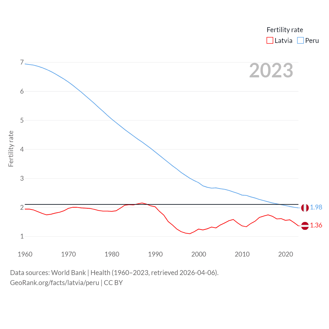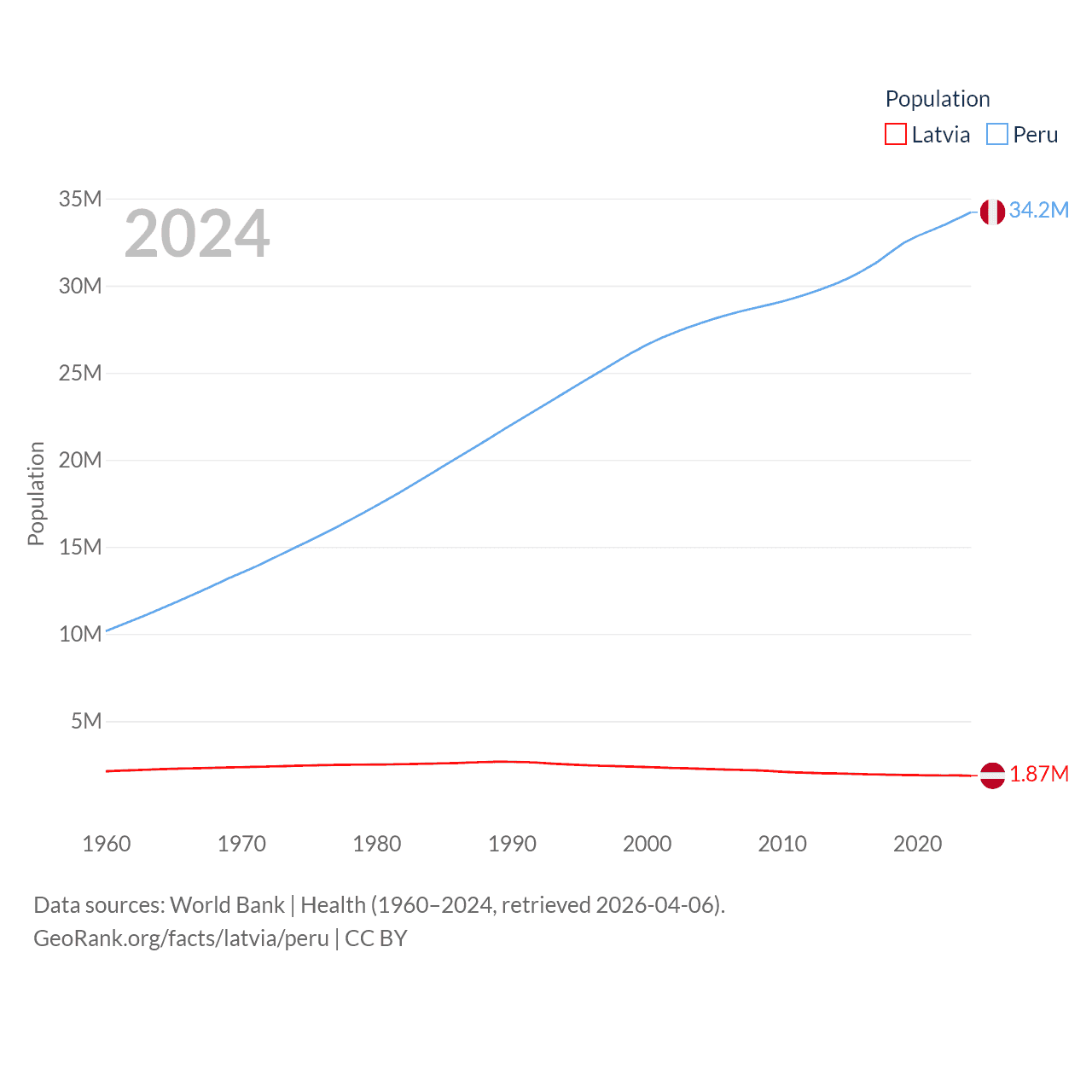 Latvia has a population of 1.87M (ranked 149/197), compared with 34.2M in Peru (ranked 48/197). Latvia's land area is 24,027 sq mi versus 494,211 sq mi for Peru (ranked 121st vs. 19th).