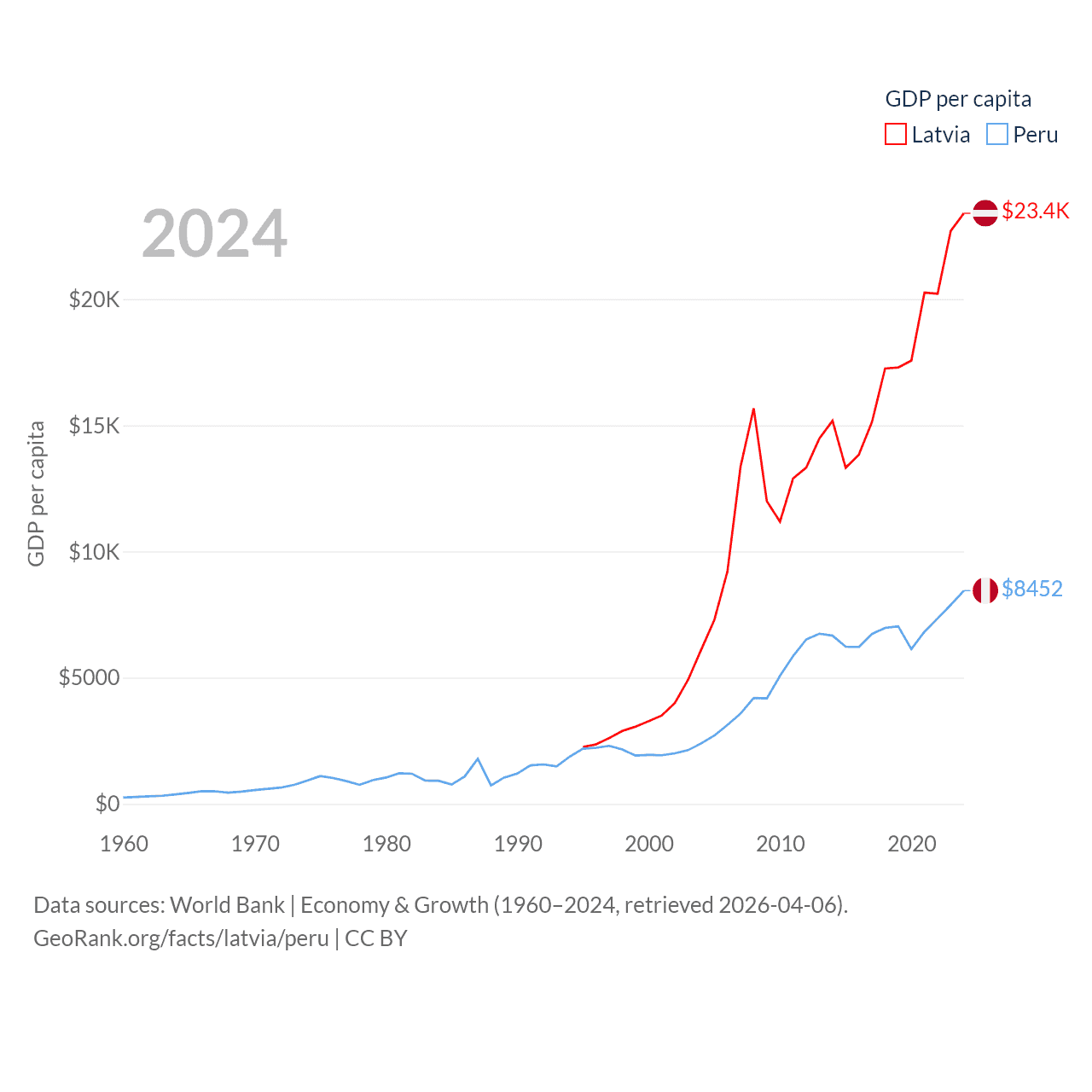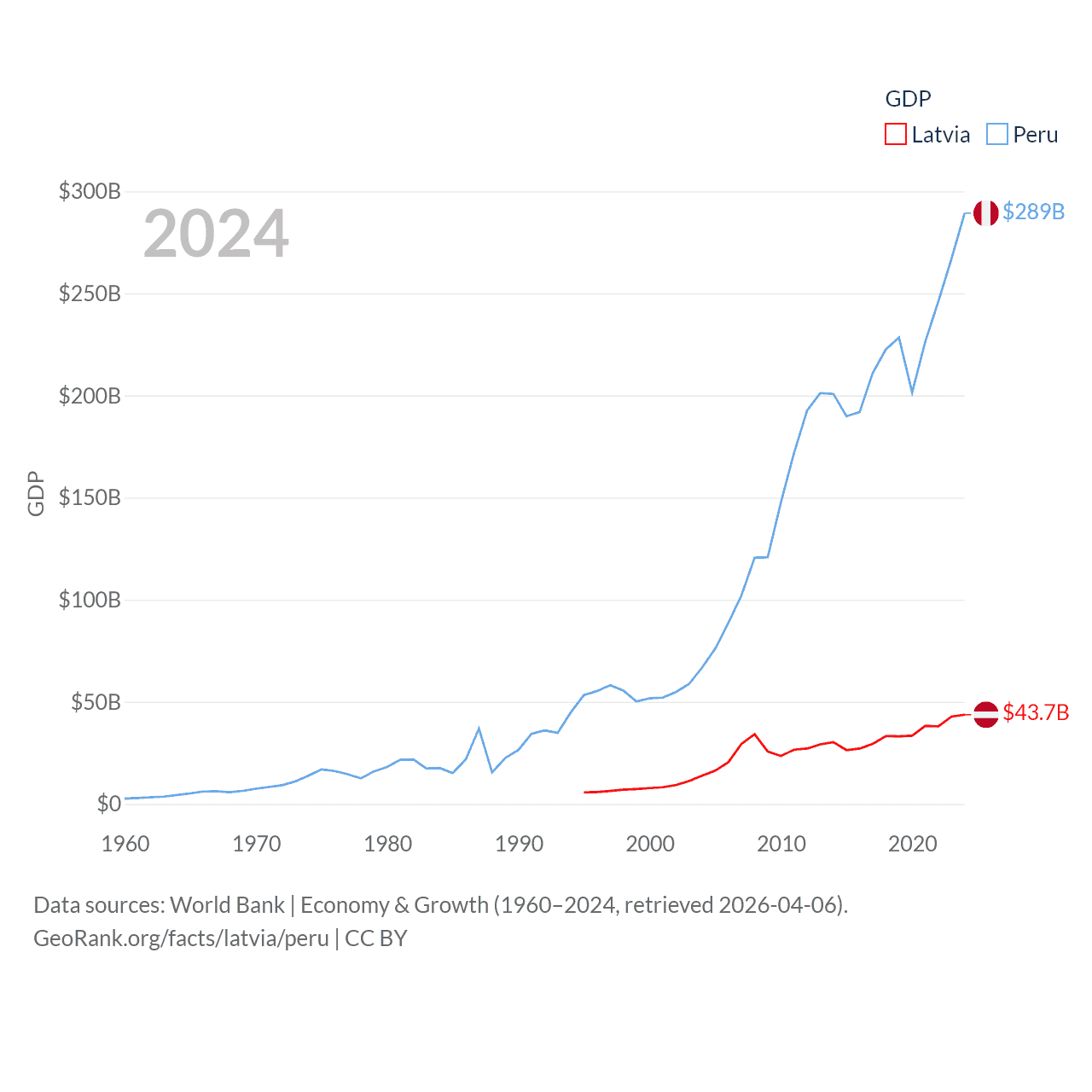 By GDP, Latvia ranks 99/197 ($43.7B) and Peru ranks 49/197 ($289B). By GDP per capita, Latvia ranks 54/197 ($23,409), while Peru ranks 91/197 ($8,452).