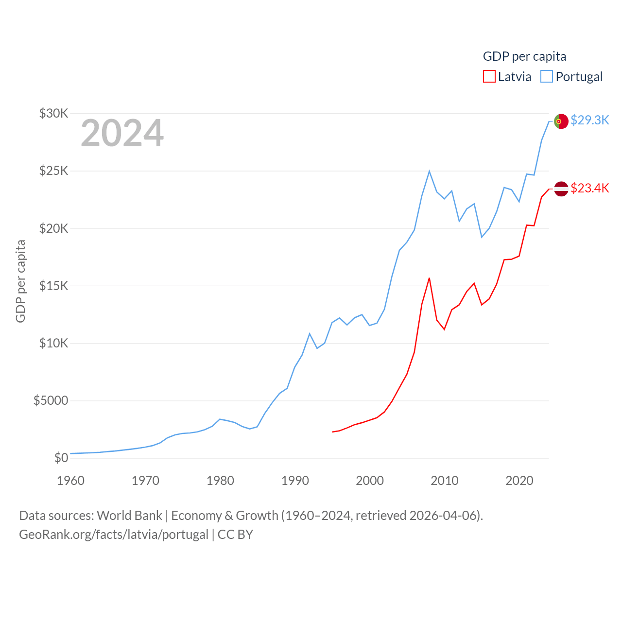 By GDP, Latvia ranks 99/197 ($43.7B) and Portugal ranks 46/197 ($313B). By GDP per capita, Latvia ranks 54/197 ($23,409), while Portugal ranks 44/197 ($29,292).