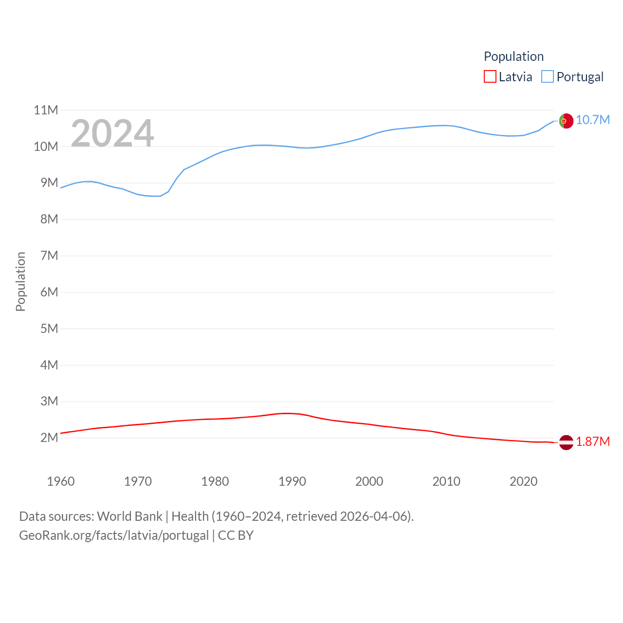 Latvia has a population of 1.87M (ranked 149/197), compared with 10.7M in Portugal (ranked 90/197). Latvia's land area is 24,027 sq mi versus 35,369 sq mi for Portugal (ranked 121st vs. 108th).