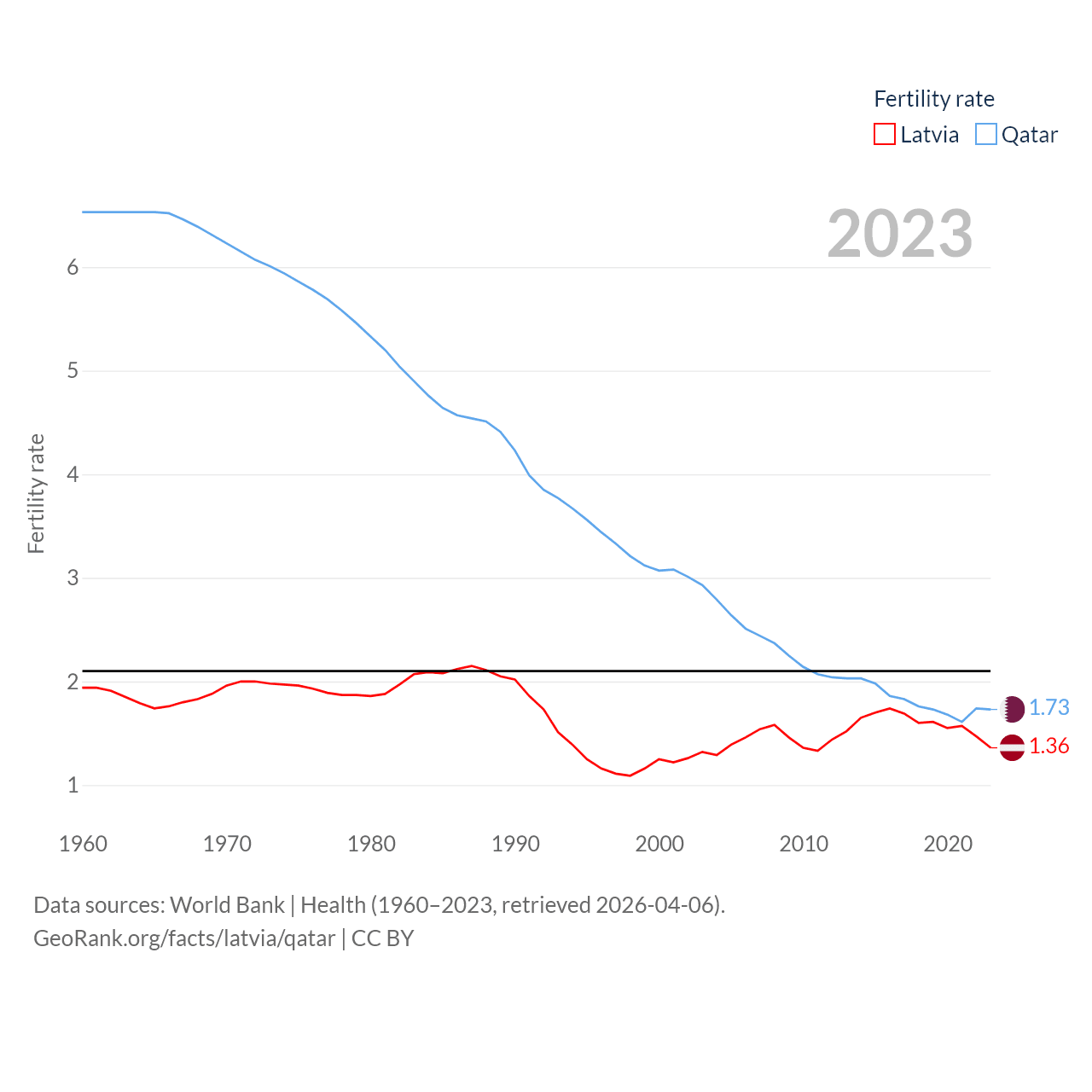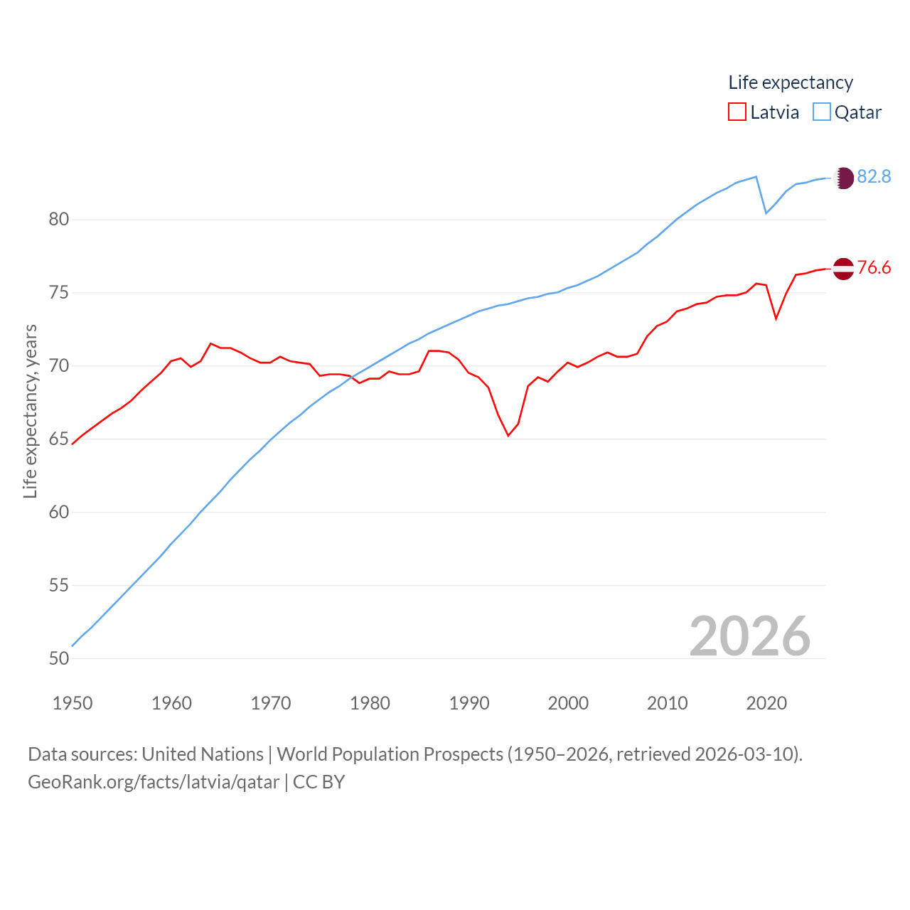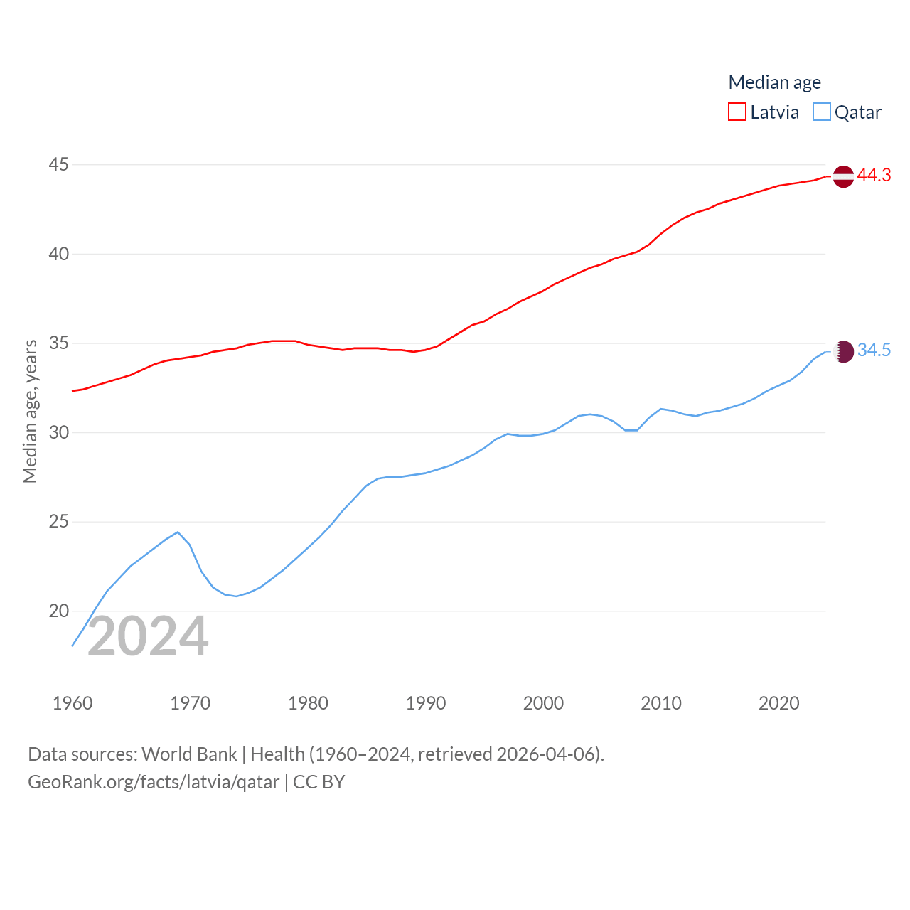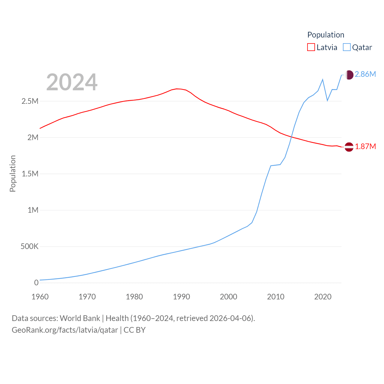Latvia has a population of 1.87M (ranked 149/197), compared with 2.86M in Qatar (ranked 138/197). Latvia's land area is 24,027 sq mi versus 4,436 sq mi for Qatar (ranked 121st vs. 158th).