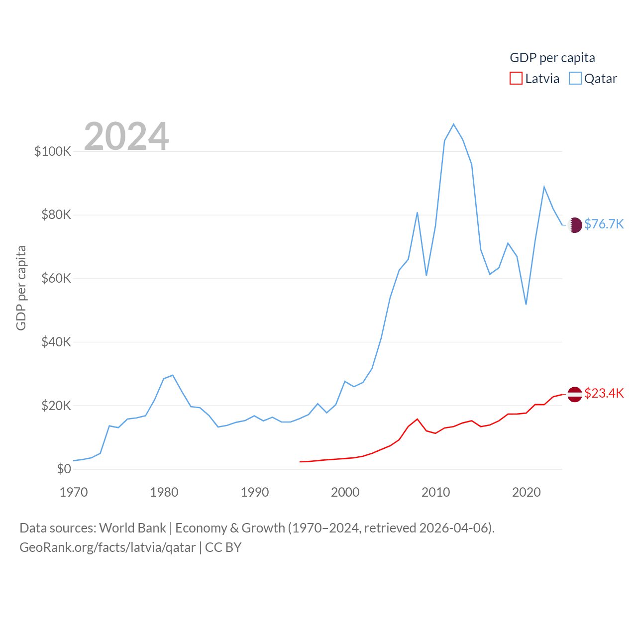 By GDP, Latvia ranks 99/197 ($43.7B) and Qatar ranks 56/197 ($219B). By GDP per capita, Latvia ranks 54/197 ($23,409), while Qatar ranks 11/197 ($76,689).