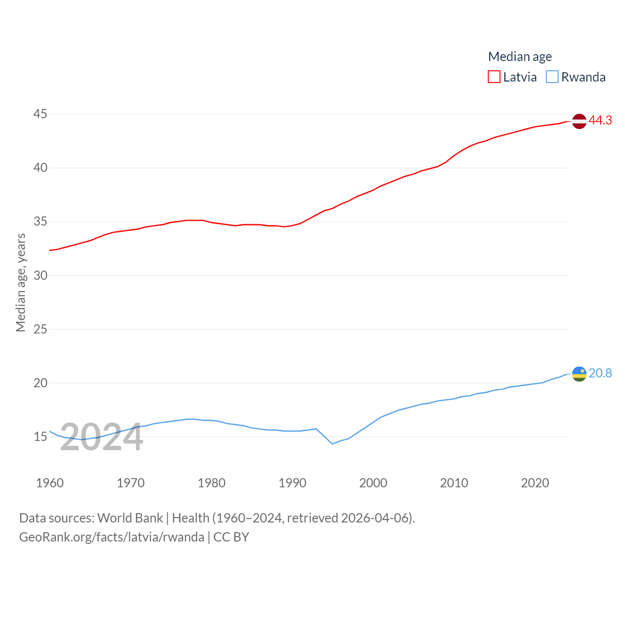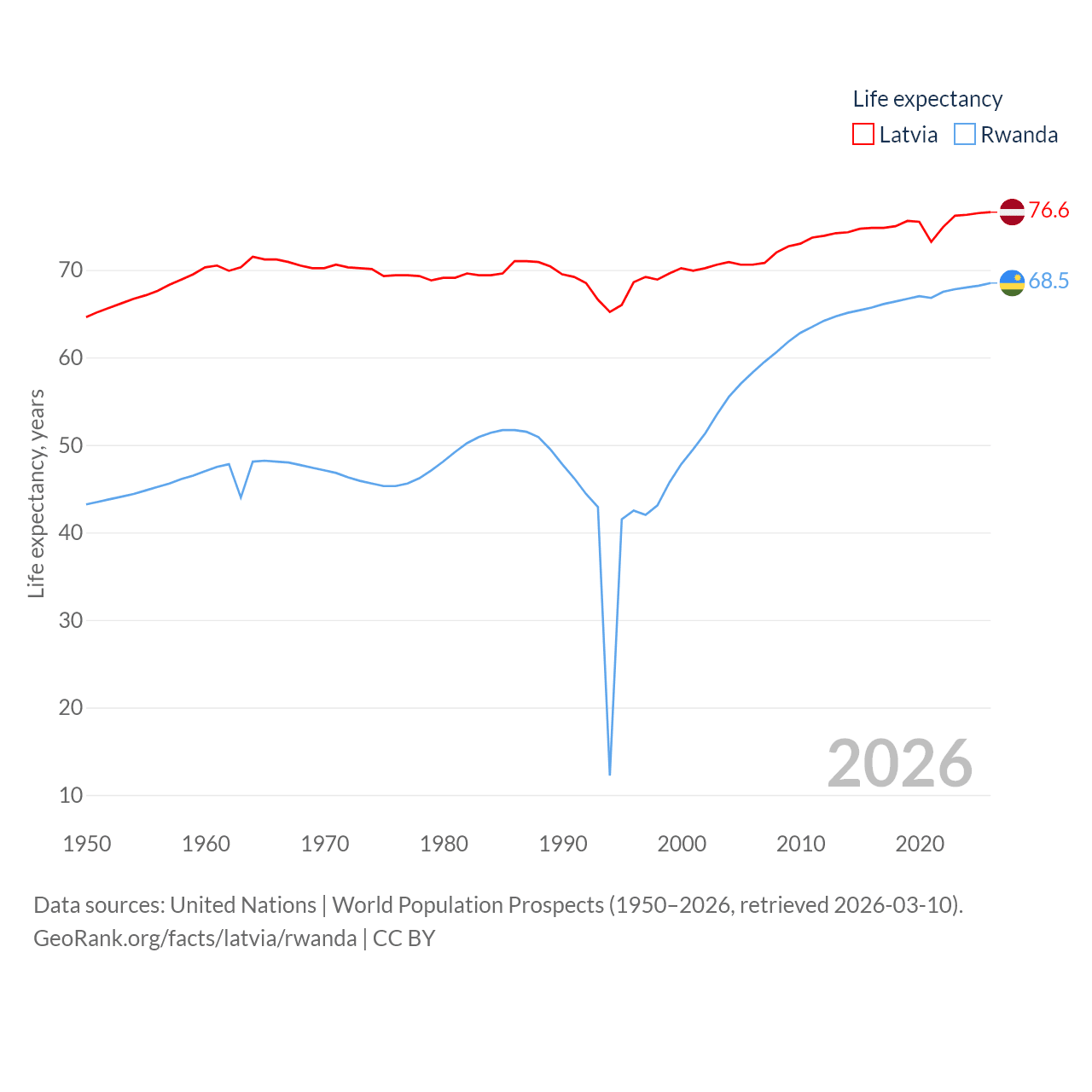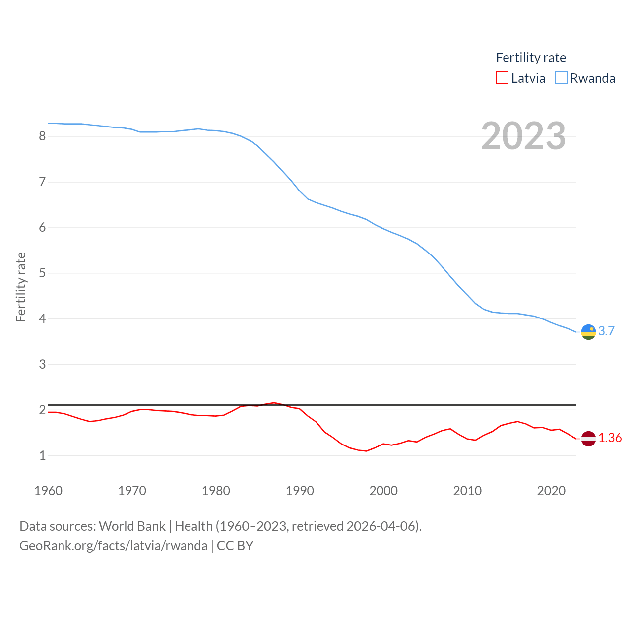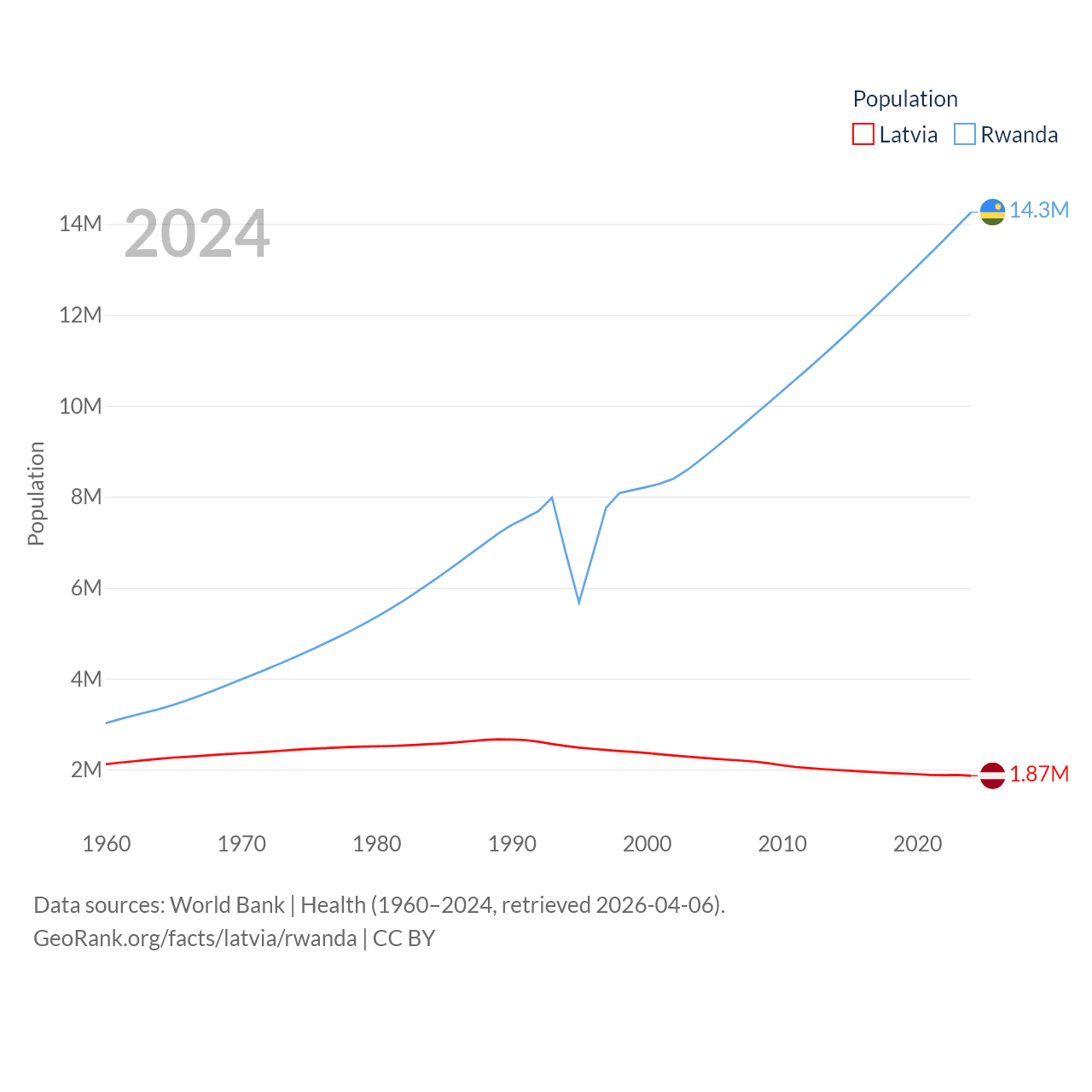 Latvia has a population of 1.87M (ranked 149/197), compared with 14.3M in Rwanda (ranked 77/197). Latvia's land area is 24,027 sq mi versus 9,525 sq mi for Rwanda (ranked 121st vs. 146th).