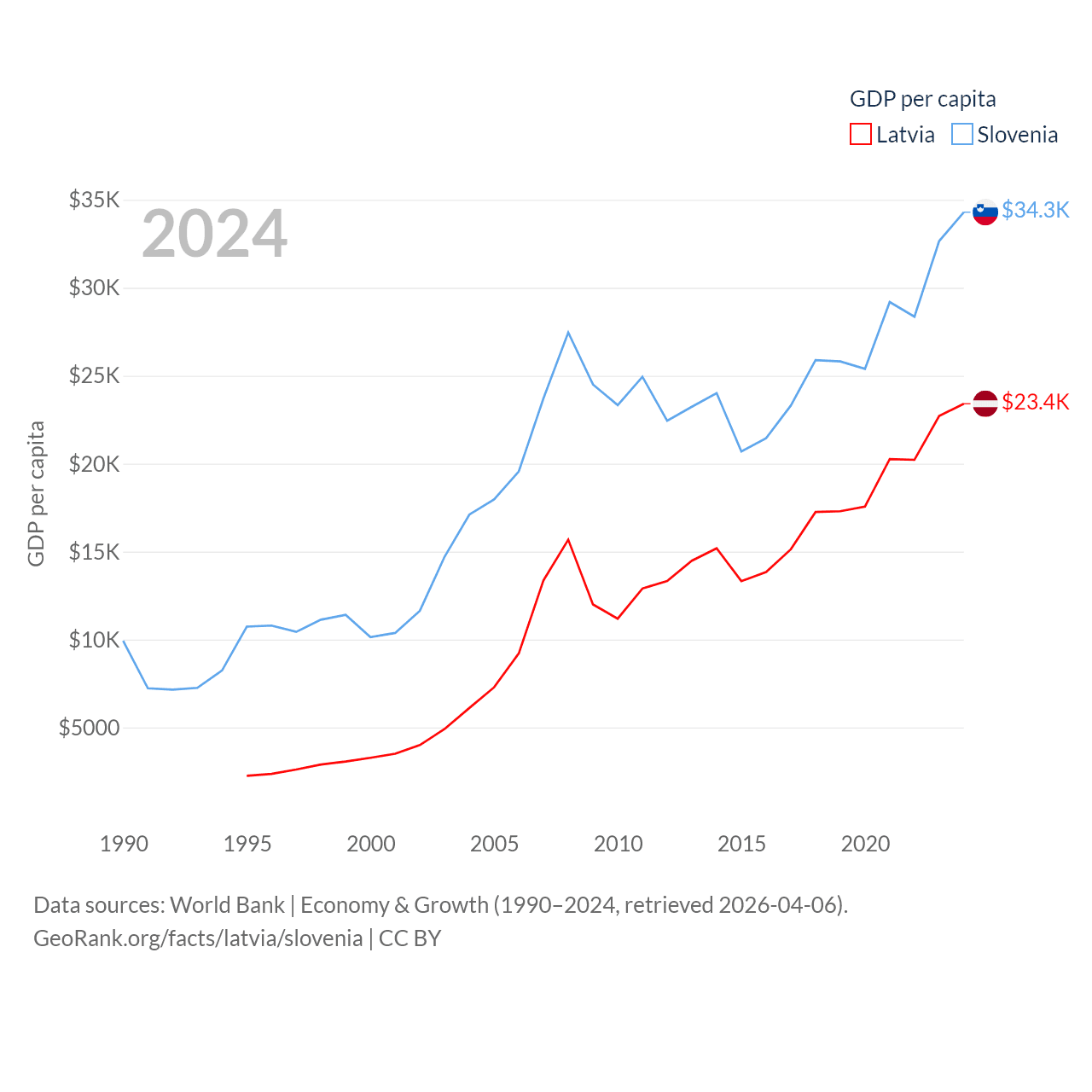 By GDP, Latvia ranks 99/197 ($43.7B) and Slovenia ranks 86/197 ($73B). By GDP per capita, Latvia ranks 54/197 ($23,409), while Slovenia ranks 34/197 ($34,301).