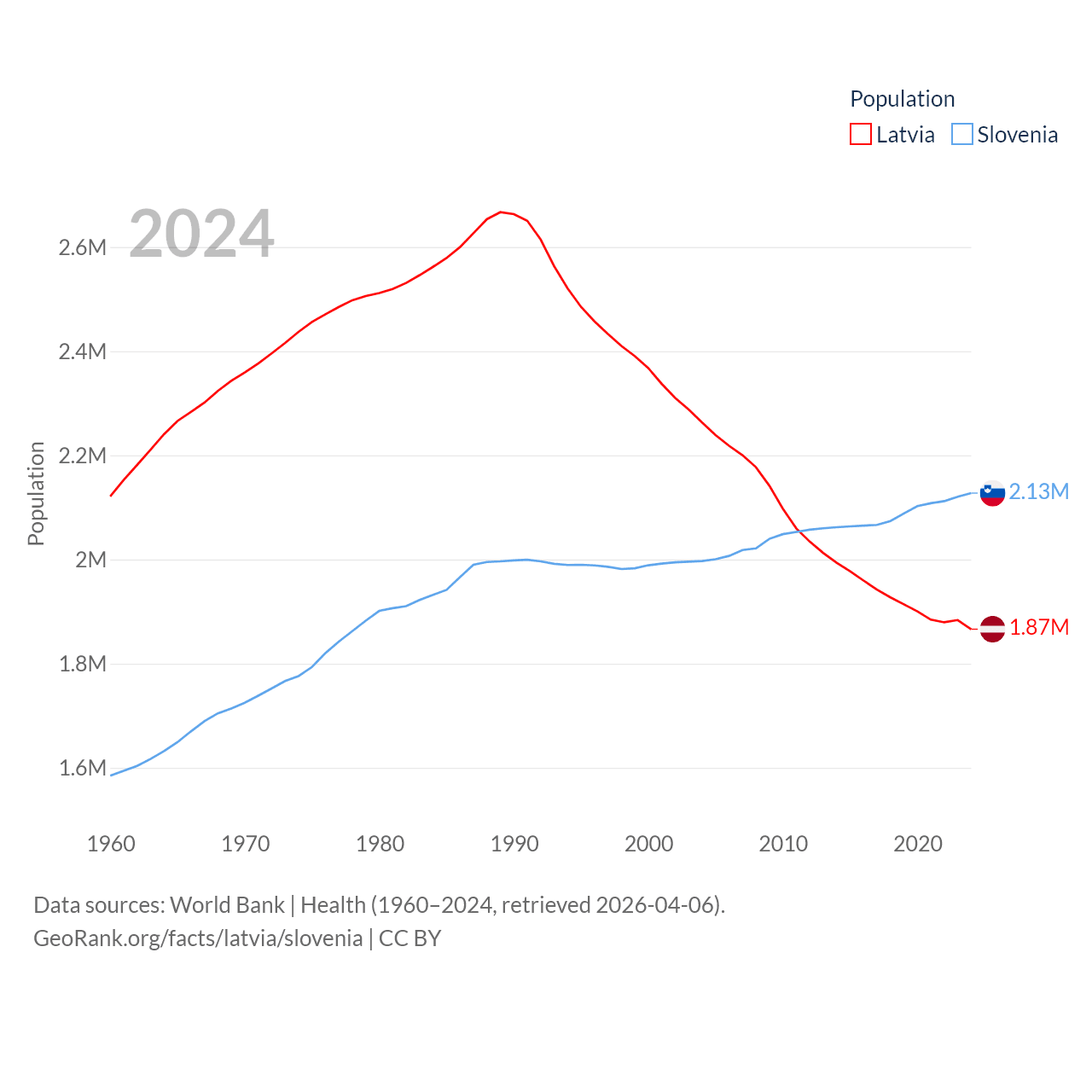Latvia has a population of 1.87M (ranked 149/197), compared with 2.13M in Slovenia (ranked 147/197). Latvia's land area is 24,027 sq mi versus 7,774 sq mi for Slovenia (ranked 121st vs. 151st).