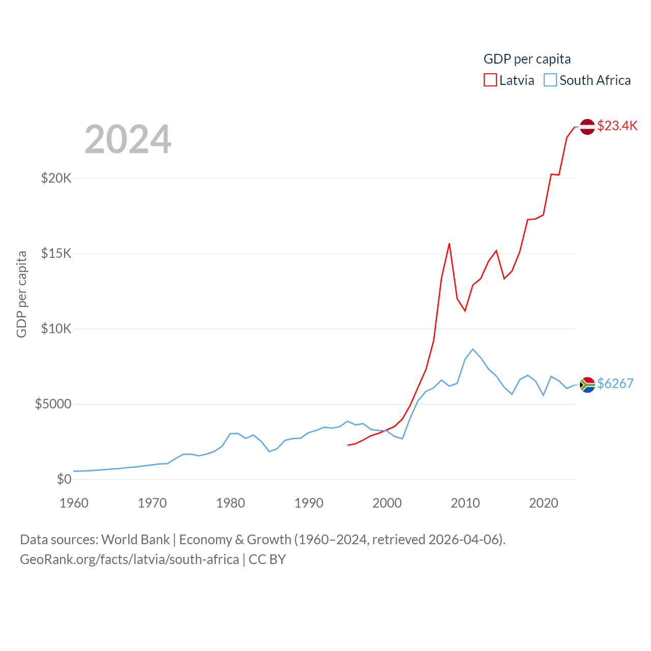 By GDP, Latvia ranks 99/197 ($43.7B) and South Africa ranks 40/197 ($401B). By GDP per capita, Latvia ranks 54/197 ($23,409), while South Africa ranks 111/197 ($6,267).