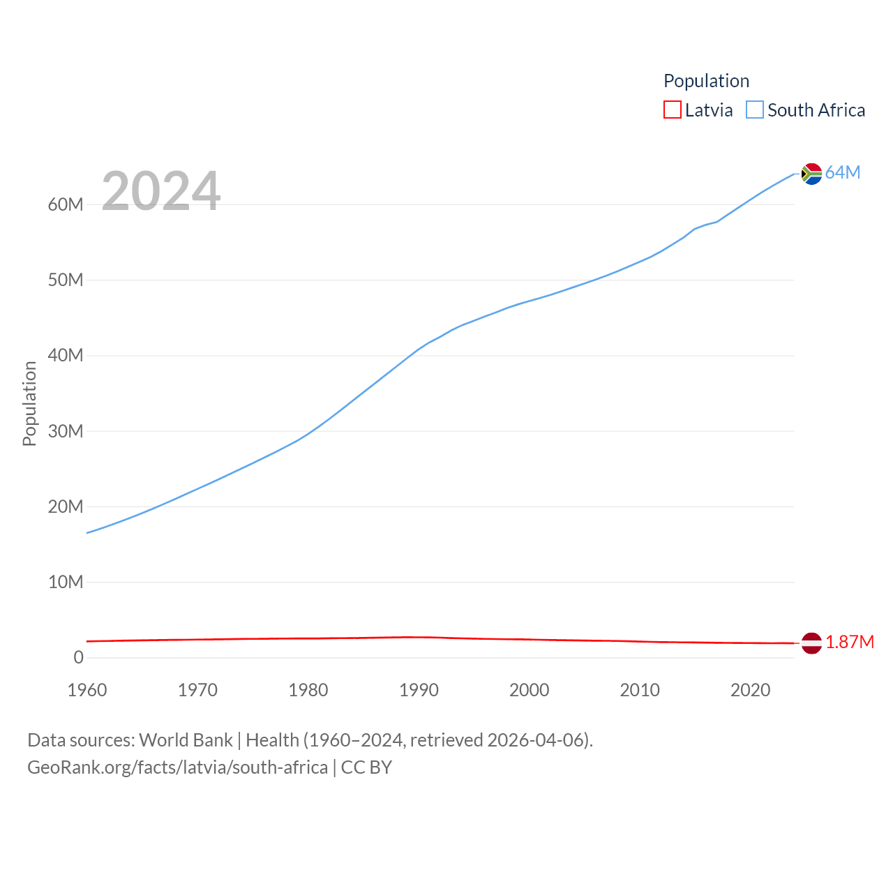 Latvia has a population of 1.87M (ranked 149/197), compared with 64M in South Africa (ranked 24/197). Latvia's land area is 24,027 sq mi versus 468,377 sq mi for South Africa (ranked 121st vs. 24th).