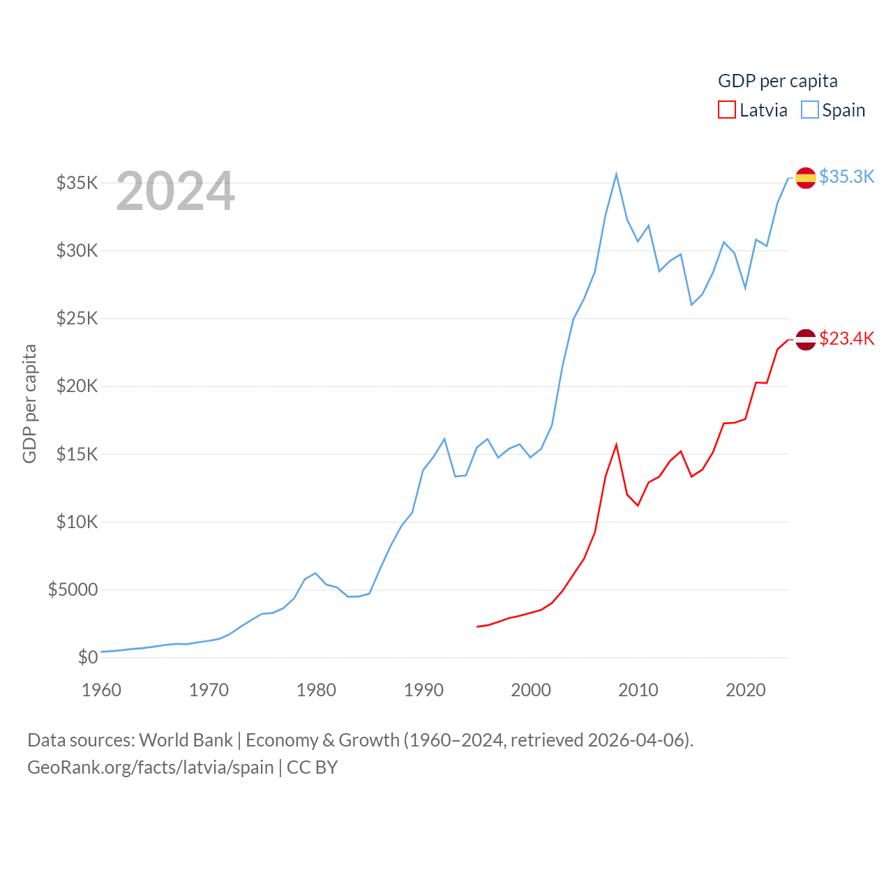 By GDP, Latvia ranks 99/197 ($43.7B) and Spain ranks 15/197 ($1.73T). By GDP per capita, Latvia ranks 54/197 ($23,409), while Spain ranks 32/197 ($35,327).