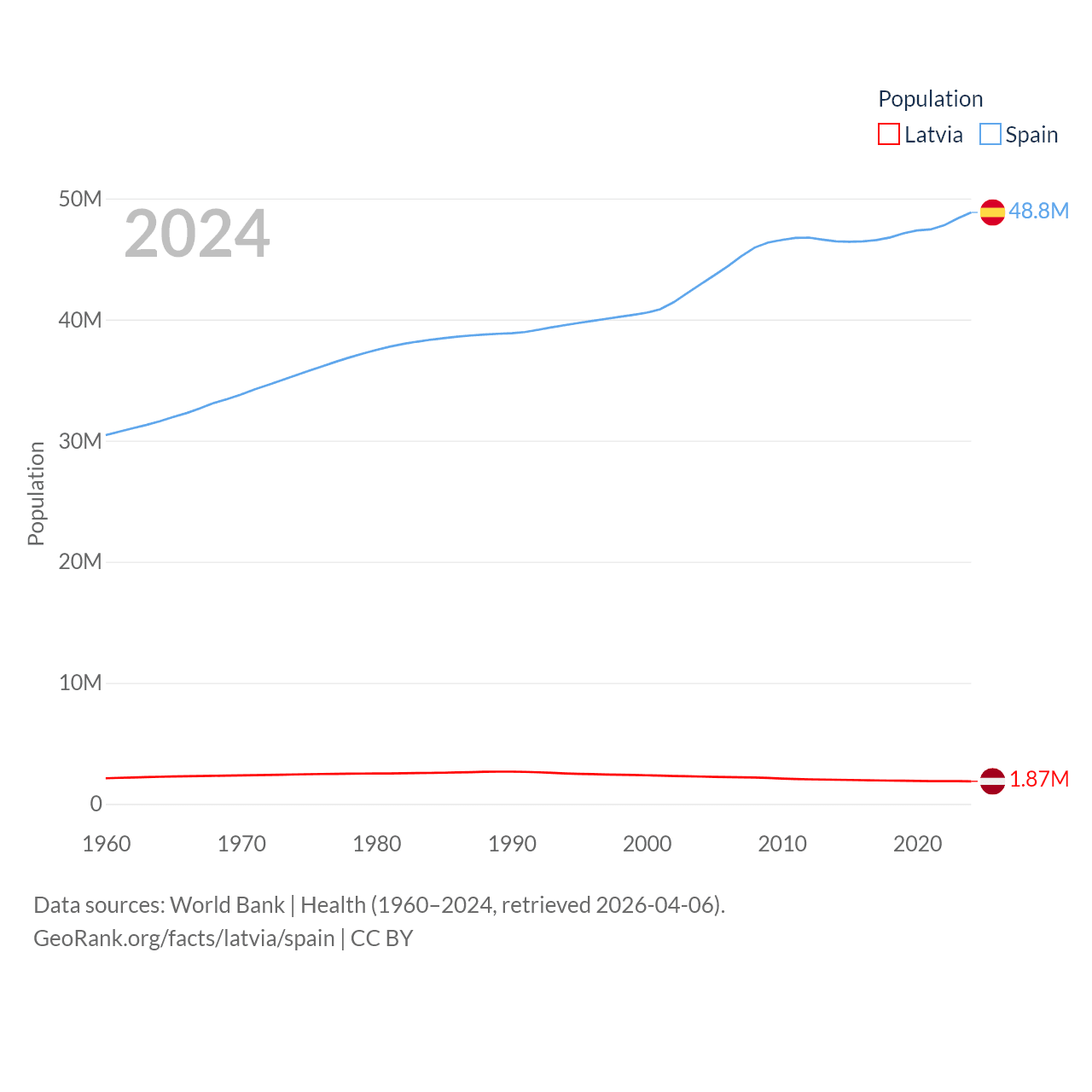 Latvia has a population of 1.87M (ranked 149/197), compared with 48.8M in Spain (ranked 32/197). Latvia's land area is 24,027 sq mi versus 192,934 sq mi for Spain (ranked 121st vs. 51st).