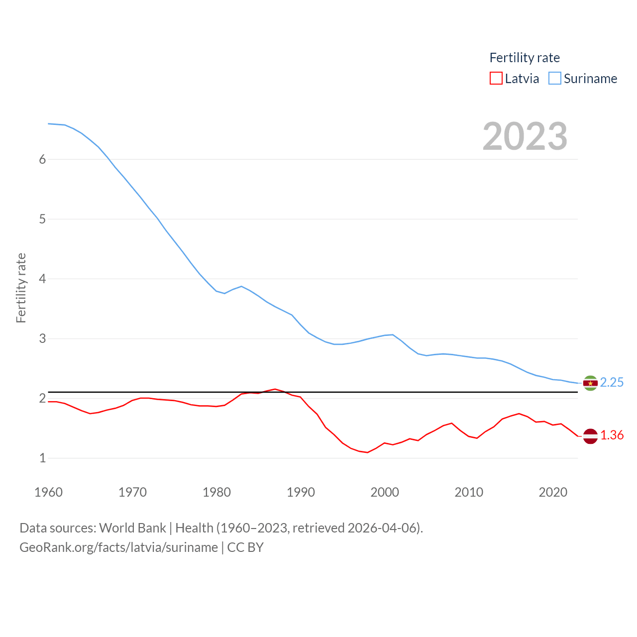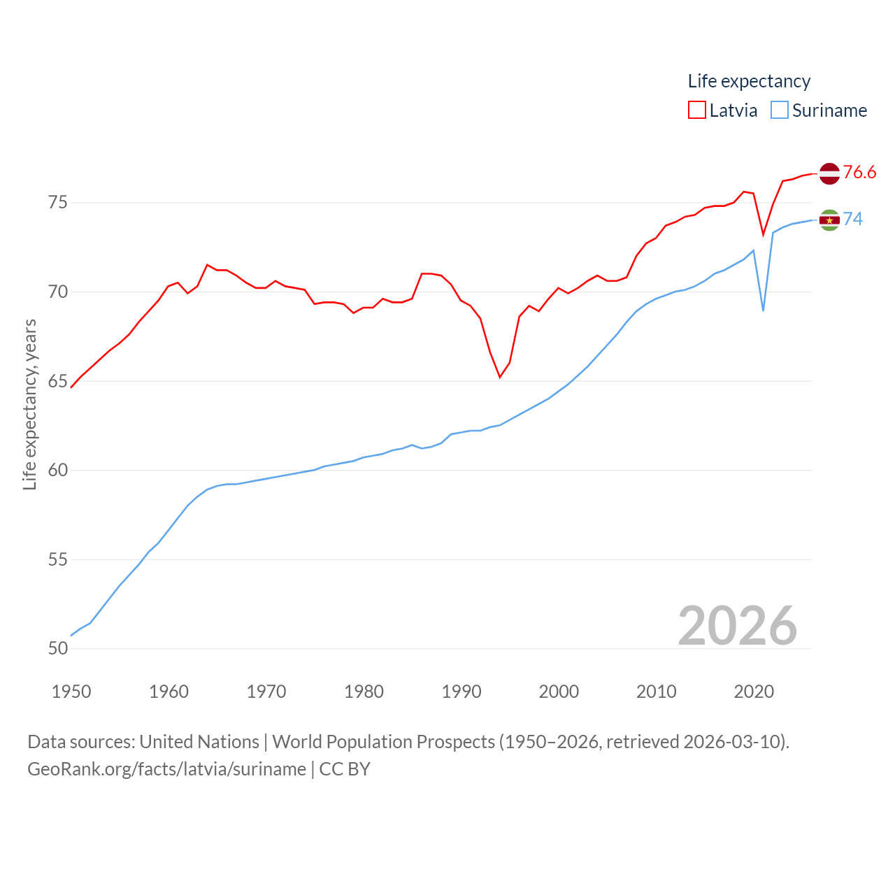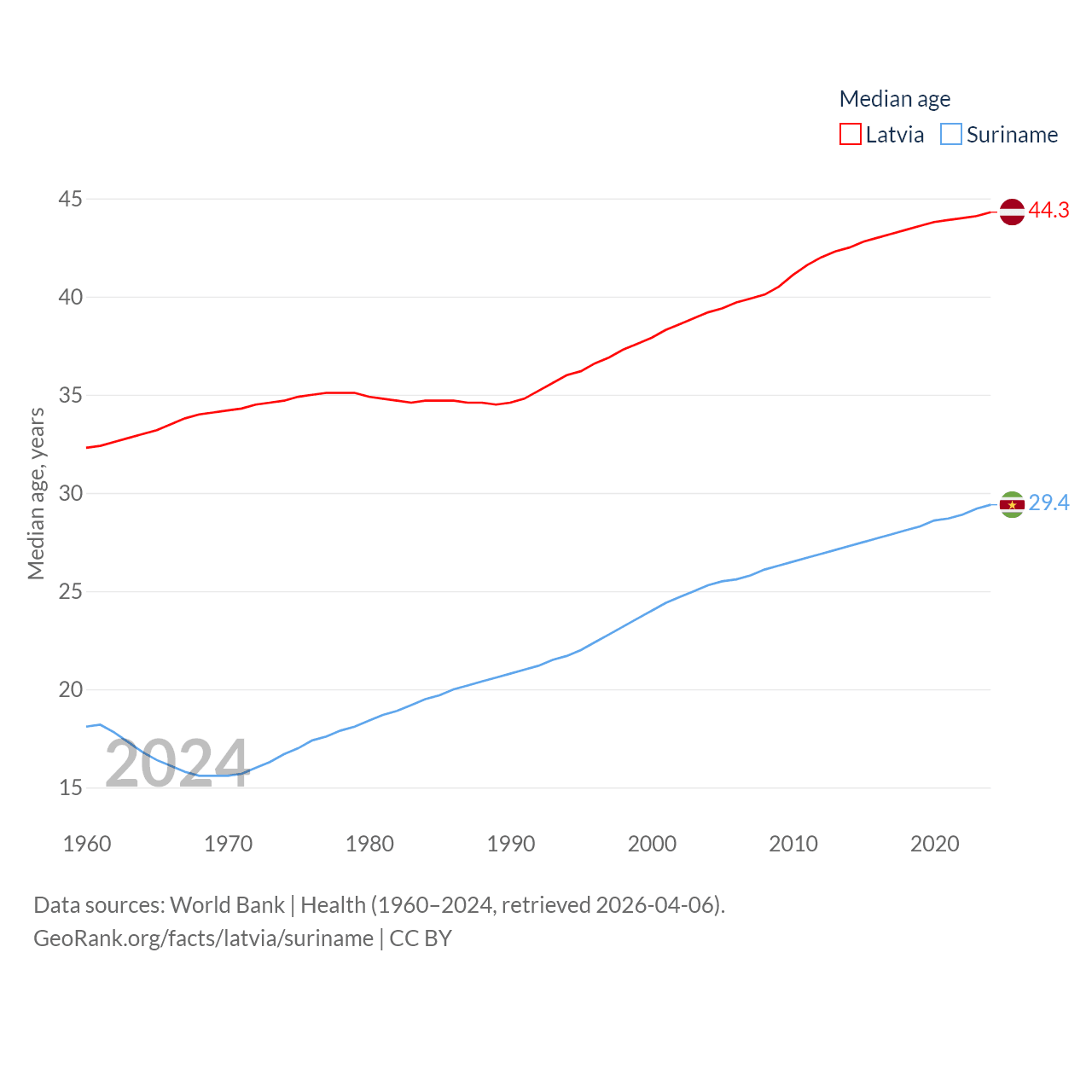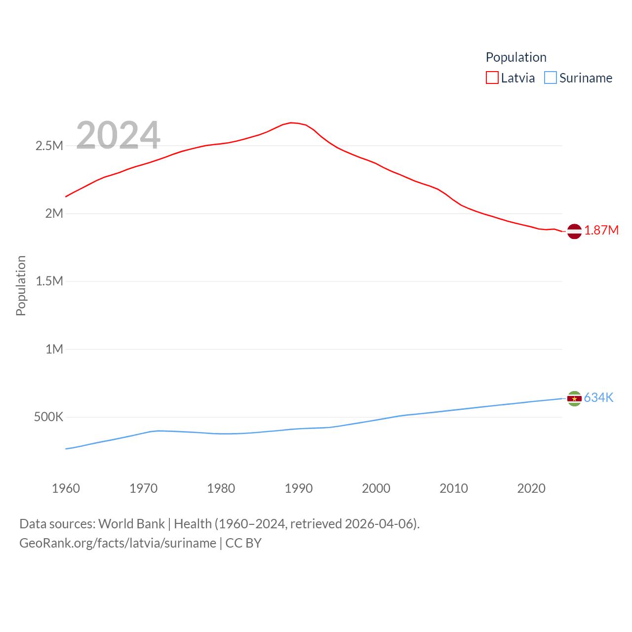 Latvia has a population of 1.87M (ranked 149/197), compared with 634K in Suriname (ranked 165/197). Latvia's land area is 24,027 sq mi versus 61,972 sq mi for Suriname (ranked 121st vs. 90th).