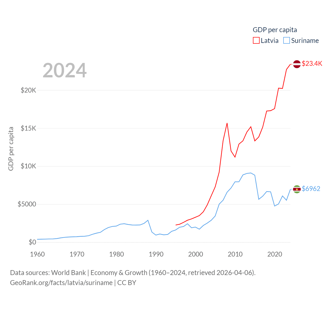 By GDP, Latvia ranks 99/197 ($43.7B) and Suriname ranks 164/197 ($4.42B). By GDP per capita, Latvia ranks 54/197 ($23,409), while Suriname ranks 102/197 ($6,962).