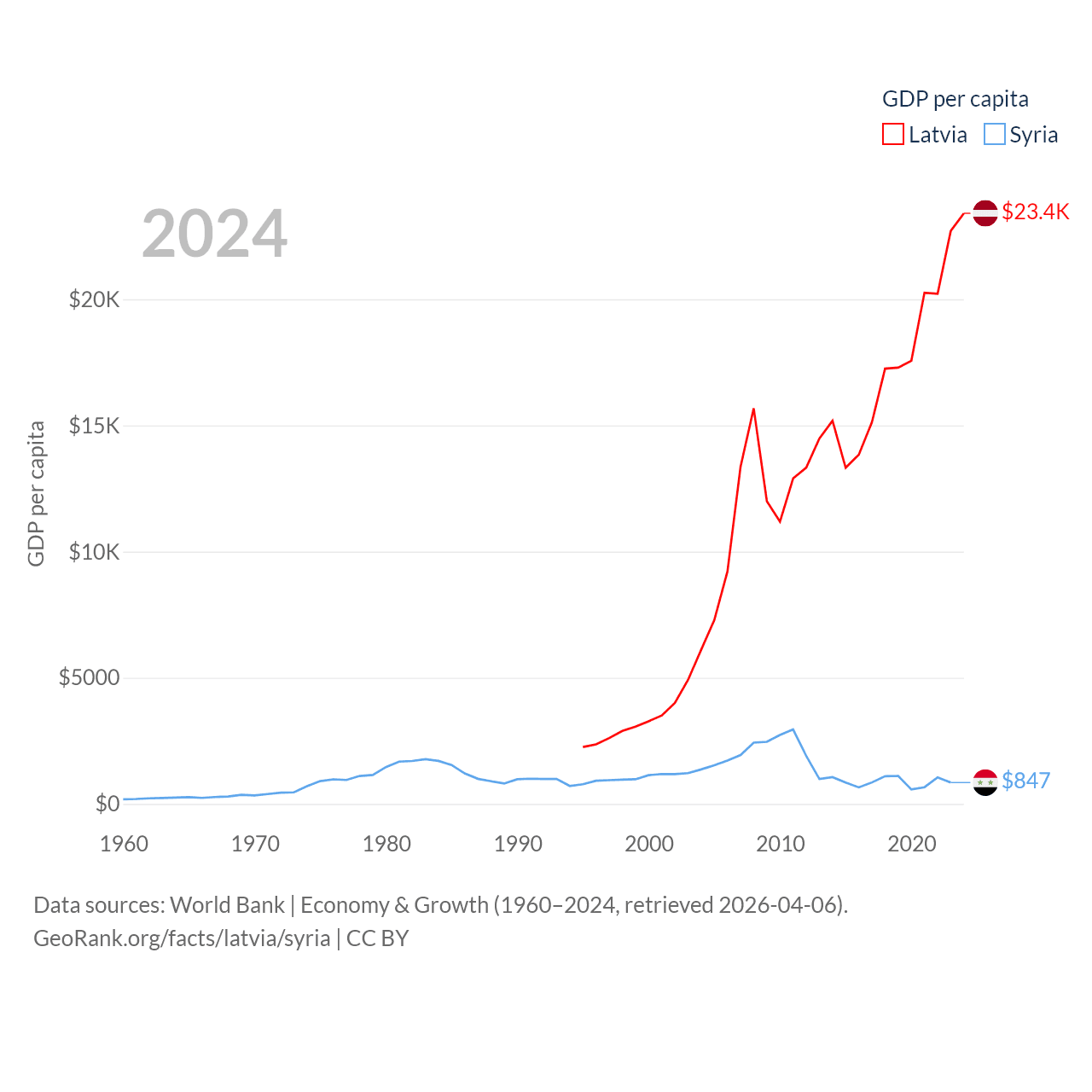 By GDP, Latvia ranks 99/197 ($43.7B) and Syria ranks 129/197 ($20B). By GDP per capita, Latvia ranks 54/197 ($23,409), while Syria ranks 185/197 ($847).