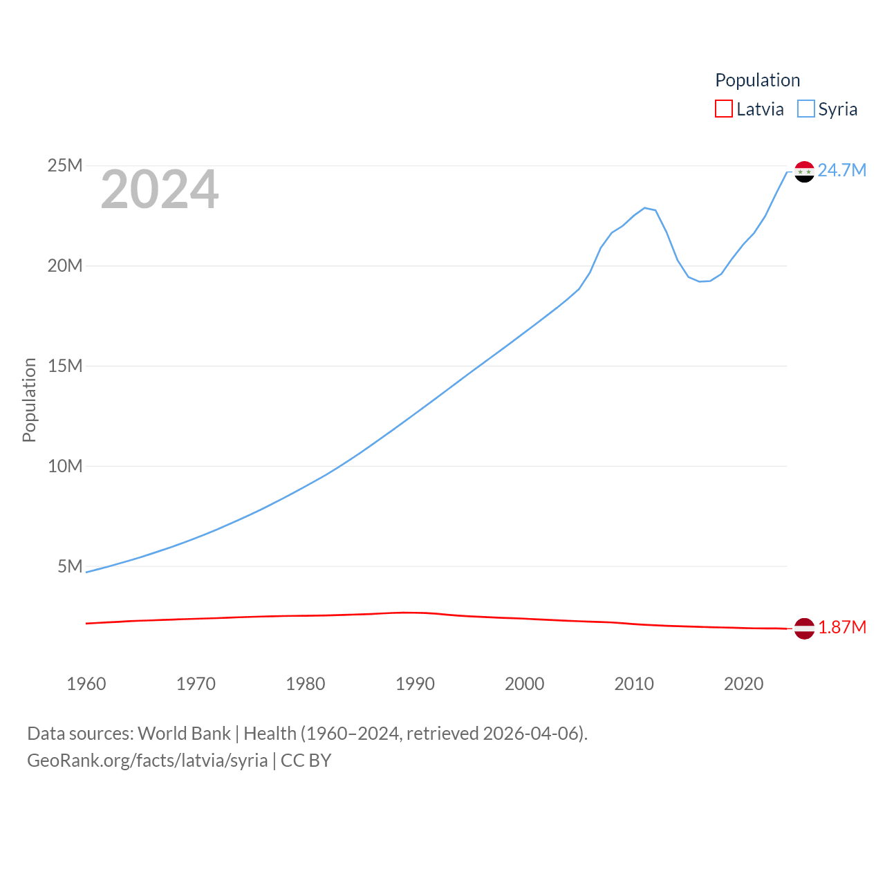 Latvia has a population of 1.87M (ranked 149/197), compared with 24.7M in Syria (ranked 57/197). Latvia's land area is 24,027 sq mi versus 70,900 sq mi for Syria (ranked 121st vs. 87th).