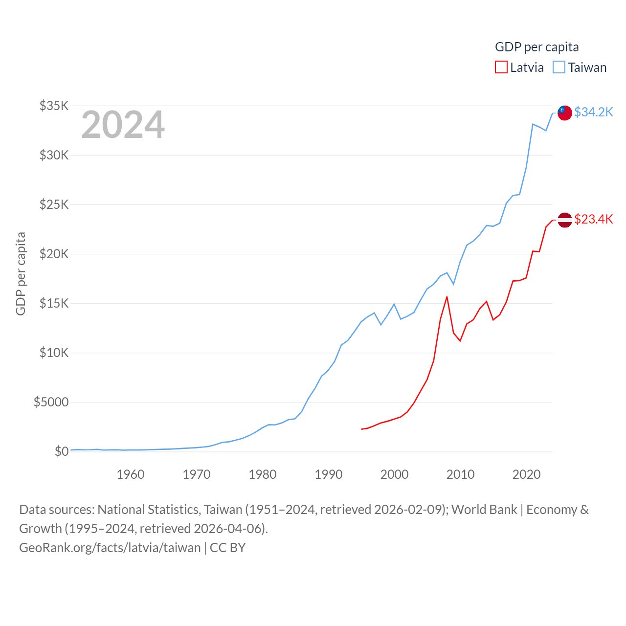 By GDP, Latvia ranks 99/197 ($43.7B) and Taiwan ranks 22/197 ($802B). By GDP per capita, Latvia ranks 54/197 ($23,409), while Taiwan ranks 35/197 ($34,238).