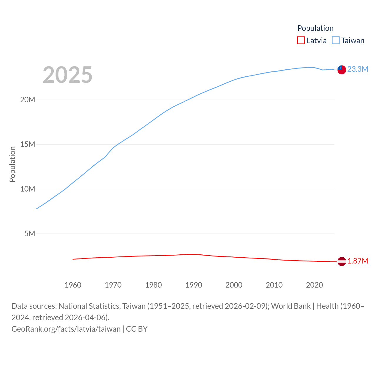 Latvia has a population of 1.87M (ranked 149/197), compared with 23.3M in Taiwan (ranked 60/197). Latvia's land area is 24,027 sq mi versus 13,976 sq mi for Taiwan (ranked 121st vs. 133rd).