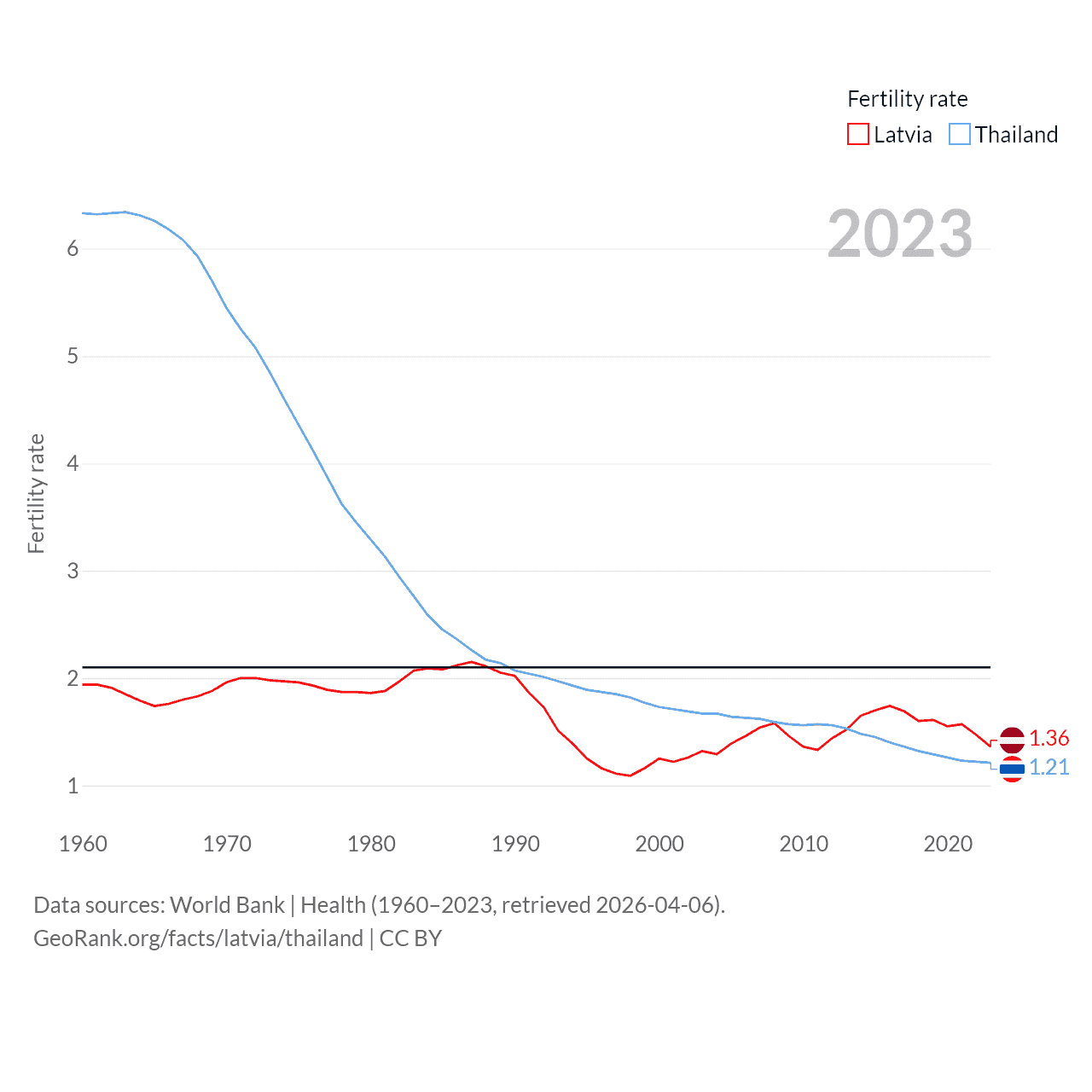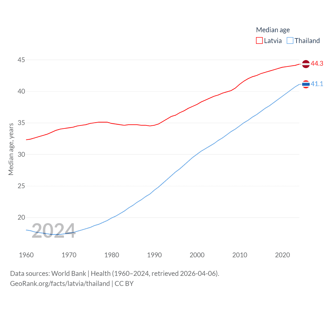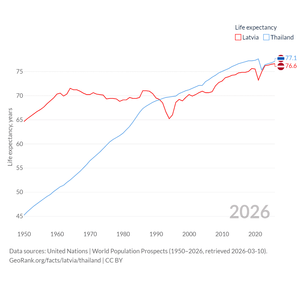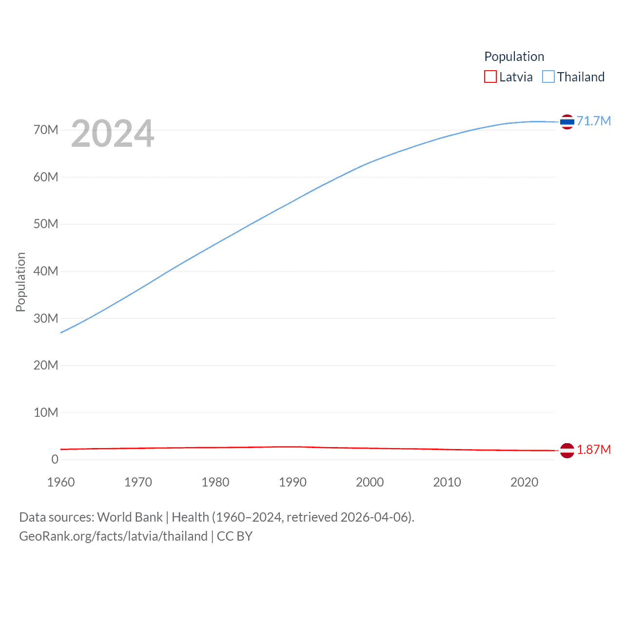 Latvia has a population of 1.87M (ranked 149/197), compared with 71.7M in Thailand (ranked 20/197). Latvia's land area is 24,027 sq mi versus 197,256 sq mi for Thailand (ranked 121st vs. 50th).