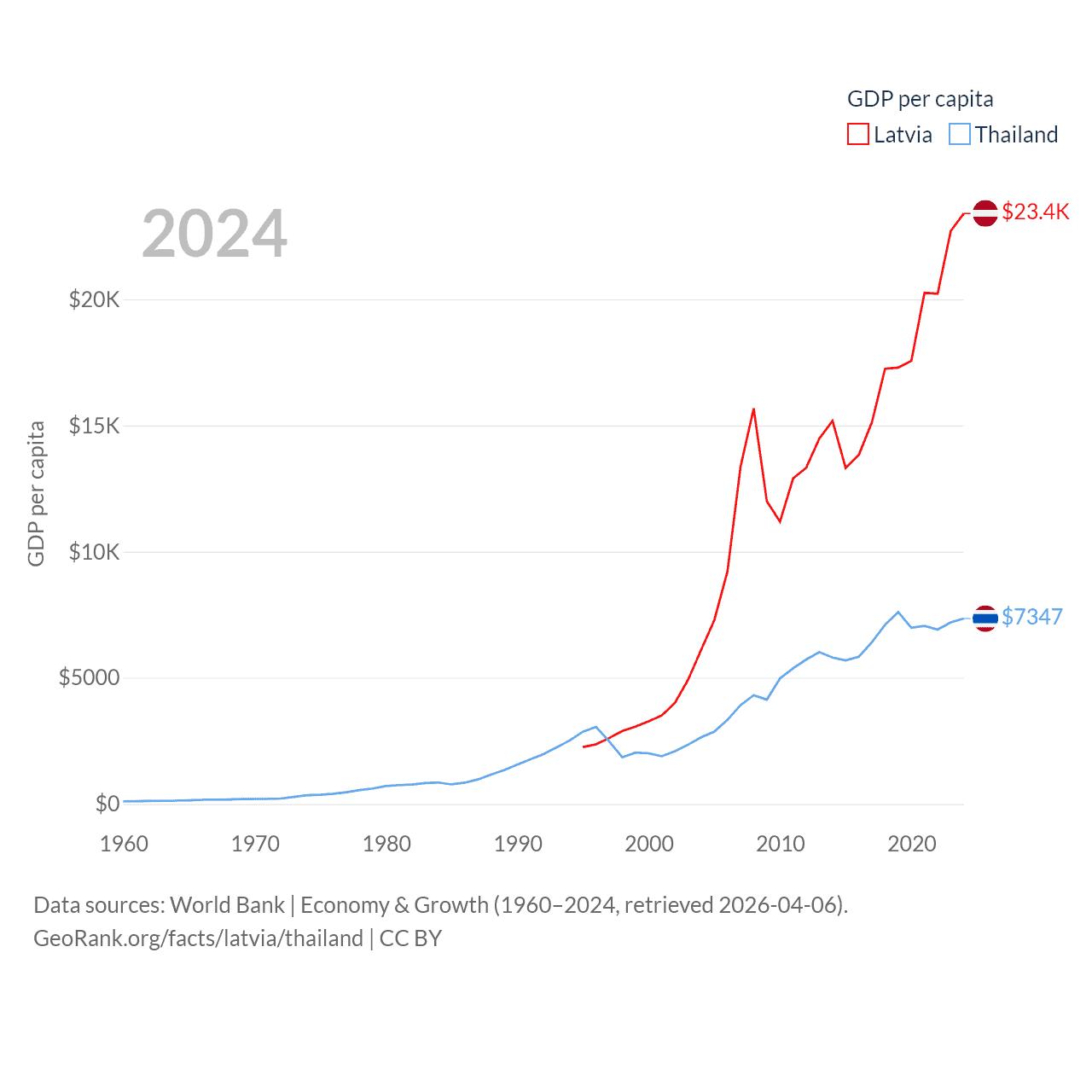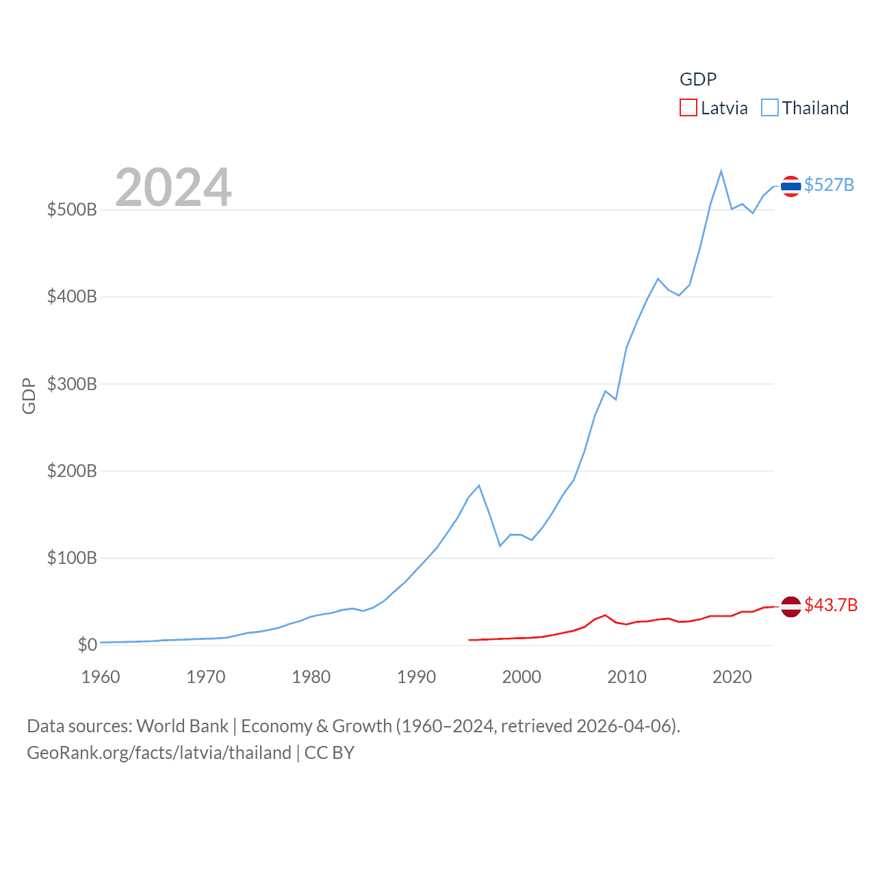 By GDP, Latvia ranks 99/197 ($43.7B) and Thailand ranks 31/197 ($527B). By GDP per capita, Latvia ranks 54/197 ($23,409), while Thailand ranks 100/197 ($7,347).